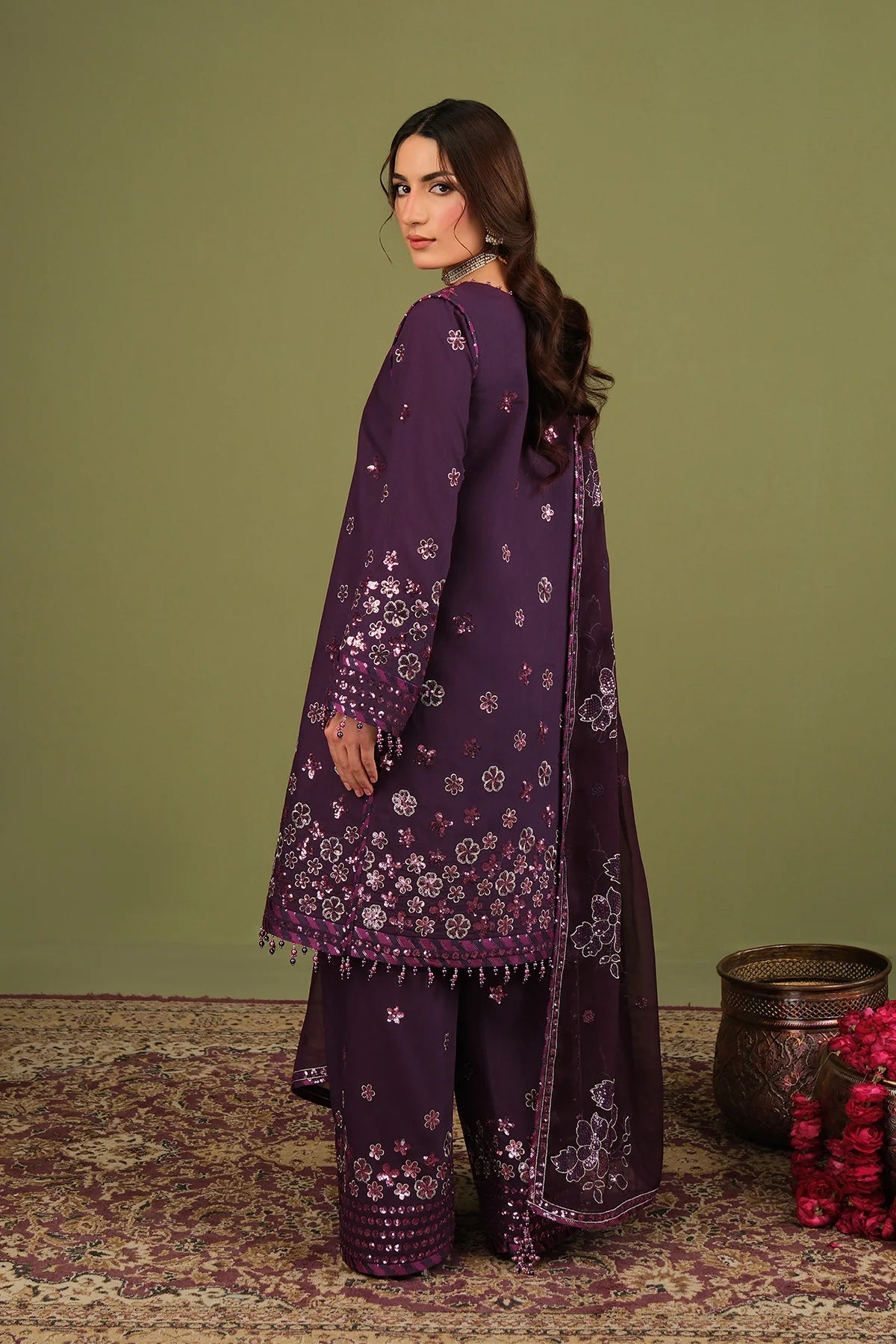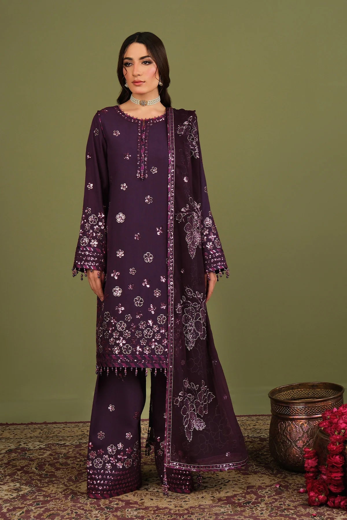 The outfit features an embroidered silk front with floral patterns, and raw silk sleeves are highlighted with embroidered borders that add structure to the design. It is paired with silk trousers finished with matching embroidery, while a chiffon dupatta with embroidered motifs and a bordered edge completes the look.