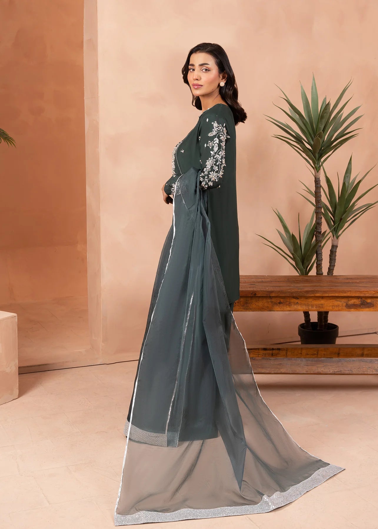 Make a statement of elegance and grace with this stunning Bottle green ensemble, meticulously crafted to capture hearts. The outfit features a raw silk short shirt,Farshi Shalwar and sheer dupatta. Ideal for a special occasion or evening affair, this outfit is a blend of tradition and contemporary artistry, crafted to make you feel nothing short of royal.