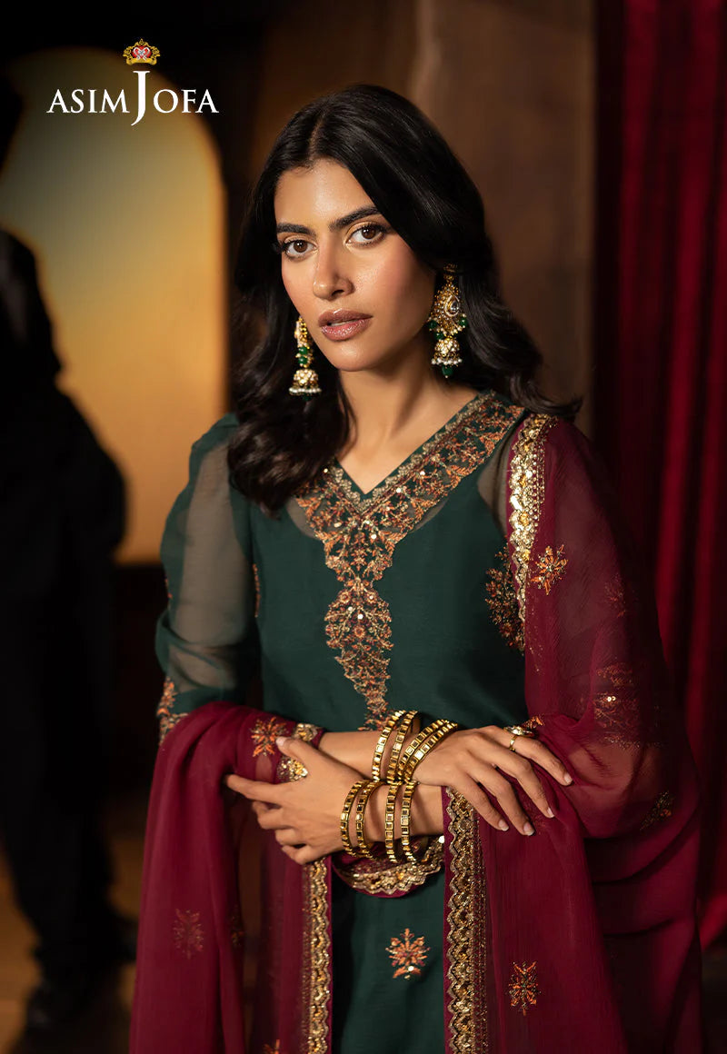Steeped in the depth of dark green, this ensemble is a graceful nod to heritage. The shirt becomes a tapestry of tradition, adorned with time-honored motifs brought to life in antique gold zari and glimmering sequins. Accents of maroon and rust thread dance through the fabric like autumn leaves caught in a golden breeze, lending warmth and richness to every inch. Paired with a thoughtfully contrasting dupatta, embroidered in harmony with the outfit’s artistry, this look speaks of legacy dressed in elegance—perfect for those who carry culture with quiet pride.