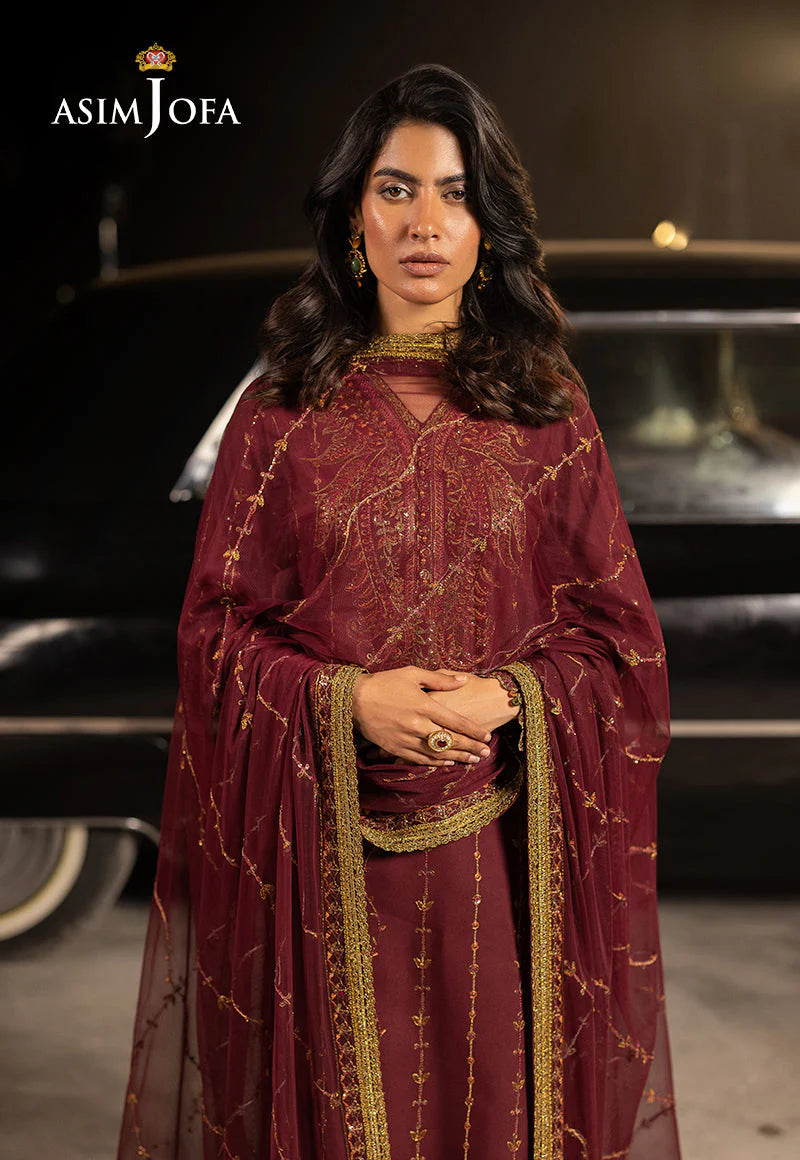 Bringing chic to festive attire, this maroon ensemble effortlessly channels modern elegance. The shirt is a vision of refined artistry, adorned with two-toned antique gold zari and glinting copper sequins that beautifully catch the light. Threadwork in rust, magenta, and olive green lends a vibrant rhythm, while the scalloped hem adds a playful yet poised finish. Paired with trousers featuring delicate floral embroidery and a beautifully embroidered dupatta, this look is tailored for the woman who writes her own rules—with style and grace.
