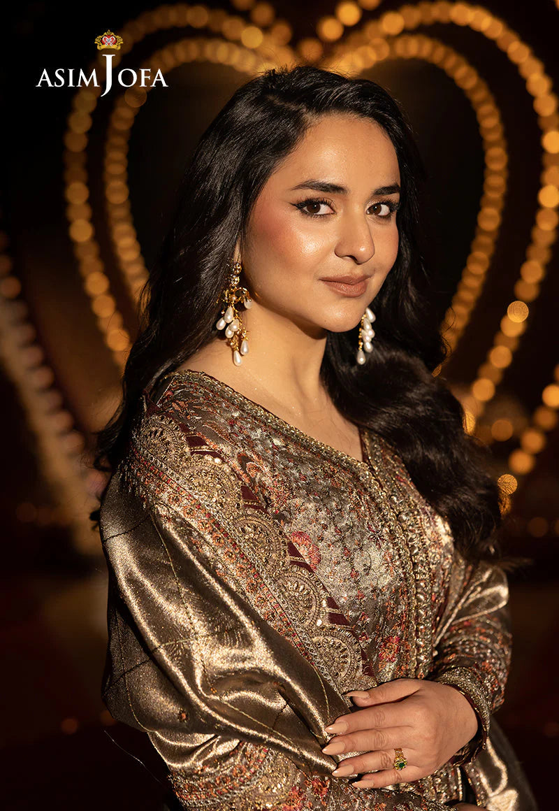 Bathed in the warm glow of copper, this zari tissue ensemble is a striking composition of tradition and opulence. The fully embroidered shirt glistens with antique gold zari and delicate light gold sequins, evoking the gleam of molten metal under twilight skies. Rich threadwork in maroon and rust hues unfurls like autumn leaves on a golden canvas, adding depth and richness to the design. Paired with a gorgeously embroidered dupatta and a contrasting dark maroon lehenga, minimally embroidered for balance, this look captures the essence of regal festivity—timeless, radiant, and unforgettable.