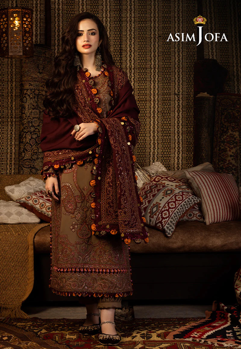 Experience the regal allure of Taupe and Deep Mahogany. This ensemble is an embodiment of cultural elegance, adorned with maroon, taupe, dull pink, and rust thick cotton threadwork, interlaced with transparent sequins. The stitches in this design are inspired by the intricate work on Pashmina Shawls, crafted with single threads and open stitches. Every element of this ensemble is deeply inspired by Kashmiri Taanka, featuring culturally inspired motifs and designs. The embroidered neckline serves as a gateway to the captivating narrative, while the all-over embroidery for the front and back, accompanied by daman borders, creates a rich tapestry. The pair of embroidered sleeves with borders are a reflection of tradition. The embroidered shawl, complete with four-sided borders and additional bunches, envelops you in the allure of Kashmir’s artistry.