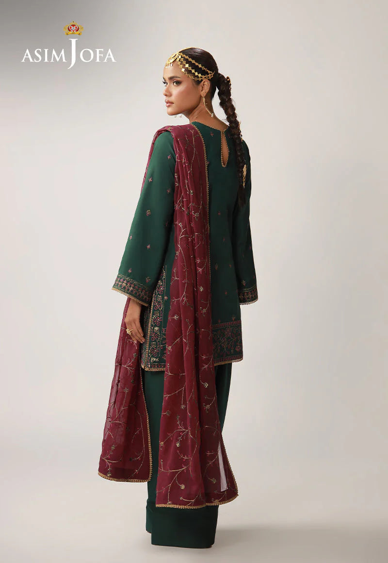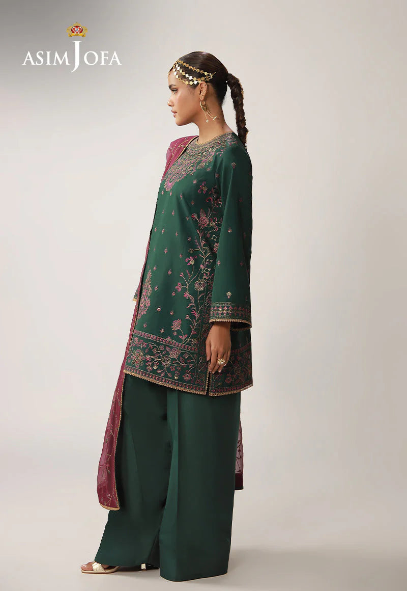 A deep green ensemble that radiates understated grandeur, its rich tone elevated by exquisite work. The shirt is adorned with antique gold zari and matte gold cupped sequins that lend a muted yet mesmerizing shimmer, while purplish-magenta and dark threadwork add depth and contrast to the intricate detailing. Designed with versatility in mind, it can be styled as either a long or short shirt, allowing you to tailor the silhouette to your personal flair. Paired with a contrasting magenta dupatta featuring an elegantly embroidered jaal, the look comes together as a striking fusion of tradition, versatility, and refined charm.