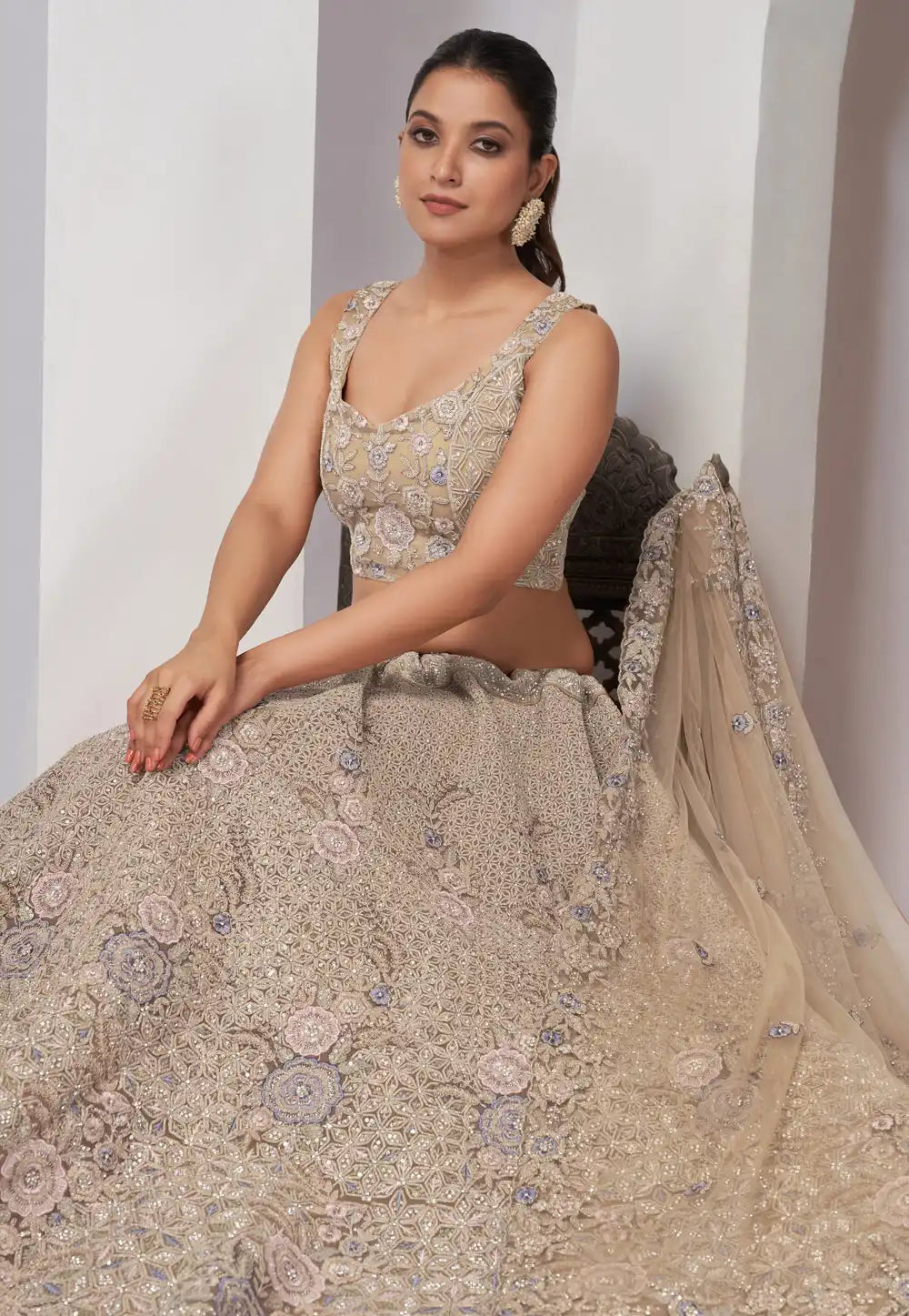 Experience the elegance and luxury of our Beige Heavy Embroidered Wedding Lehenga Choli. Made from soft net fabric and embellished with handwork, the lehenga as well the blouse feature intricate zarkan, dori and sequins embroidery all over. Comes with soft net embroidered dupatta. With a cancan netting, this piece is perfect for any wedding and festive occasions.