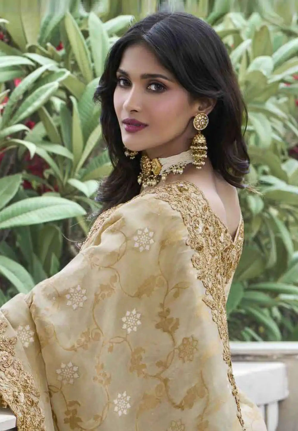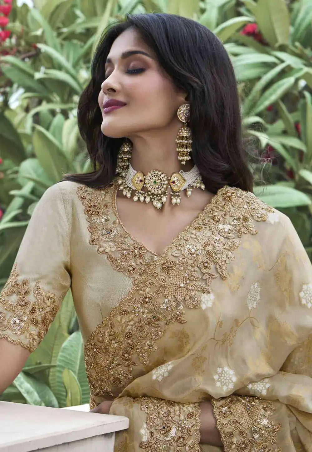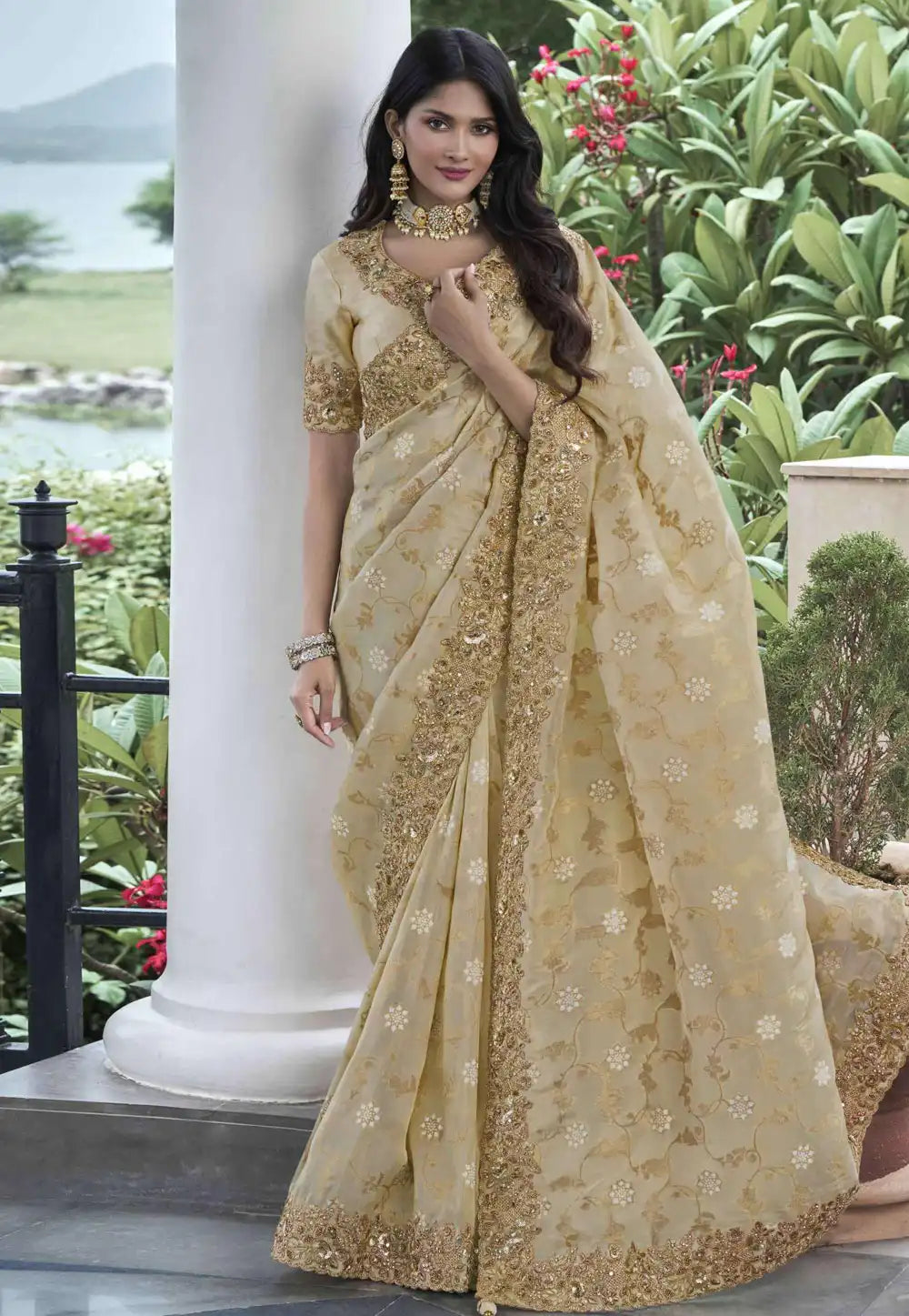 Beige Embroidered Wedding Saree features a silk scalloped saree in enhanced with dangles, zari woven in floral motifs and resham, zari, sequins border work. Comes with silk embroidered blouse.