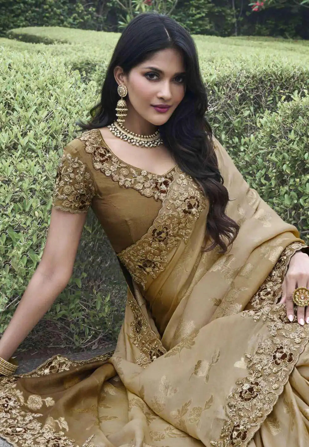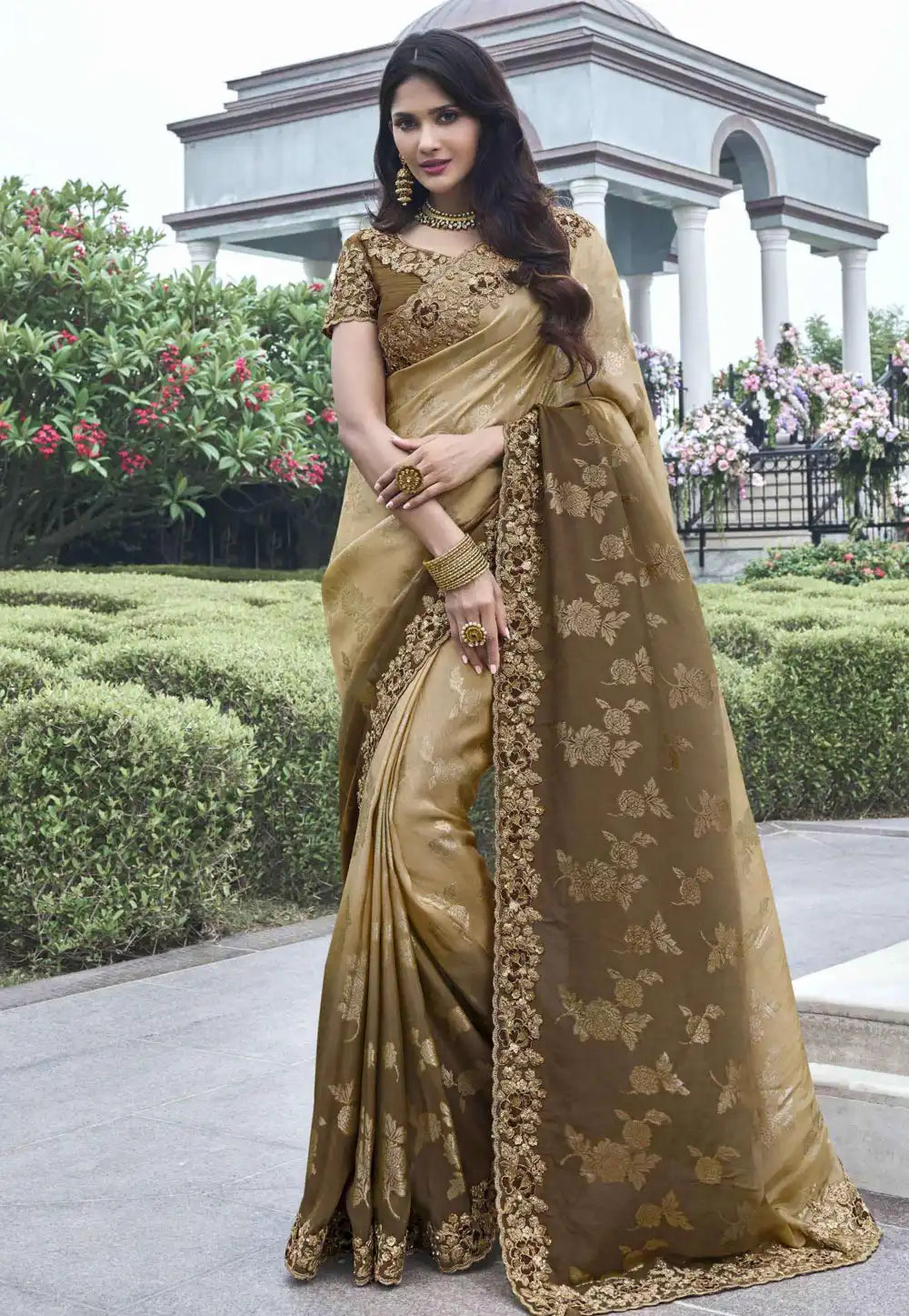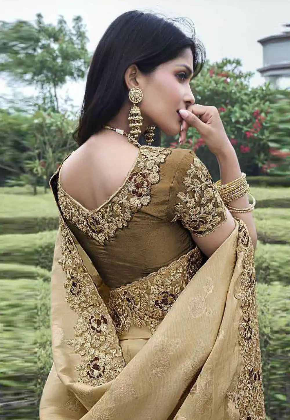 Beige Embroidered Wedding Saree features a silk scalloped saree in enhanced with dangles, zari woven in floral motifs and resham, zari, sequins border work. Comes with silk embroidered blouse.