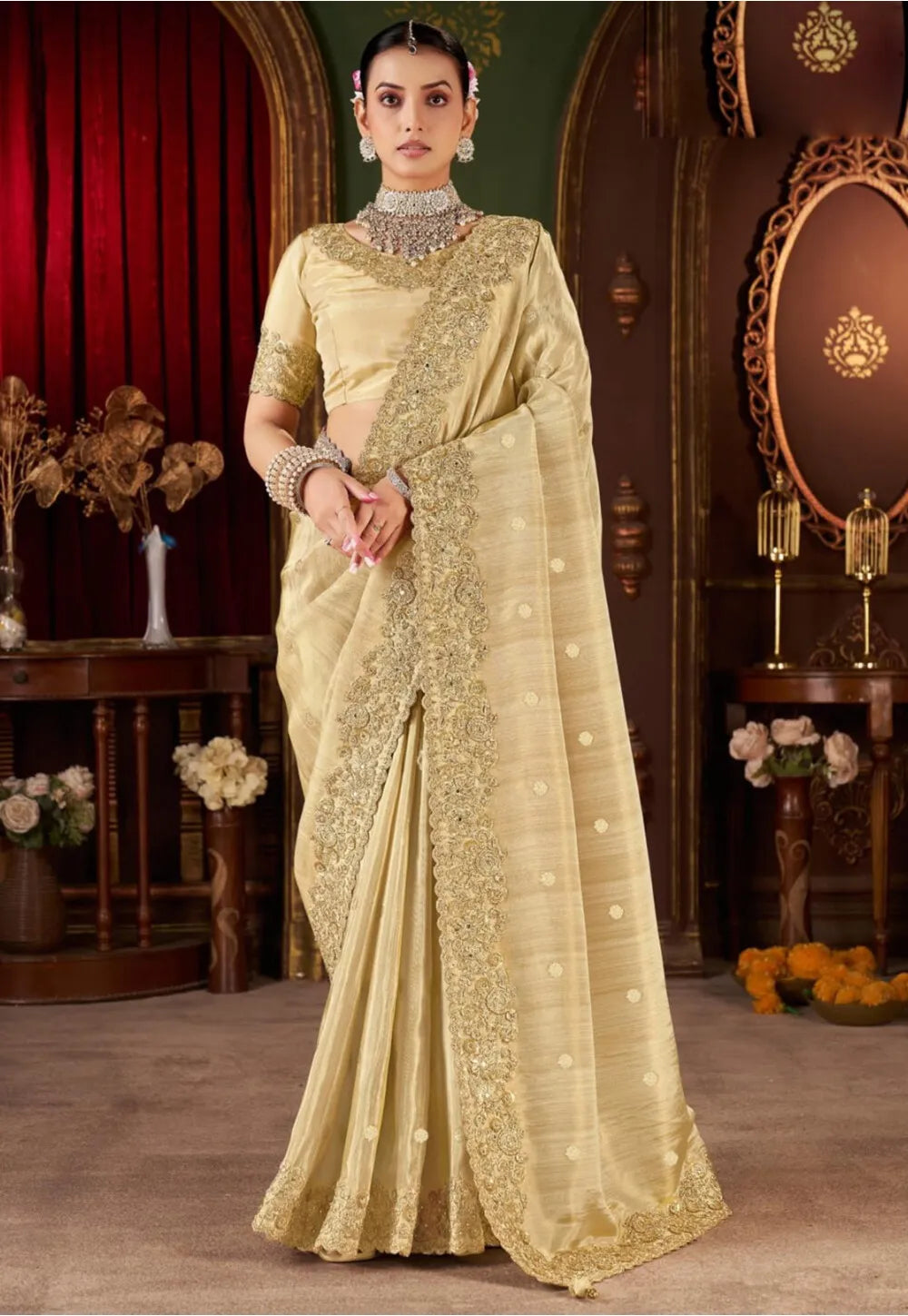 Beige Embroidered Wedding Saree features a silk scalloped saree in enhanced with dangles, zari woven in floral motifs and resham, zari, sequins border work. Comes with silk embroidered blouse.