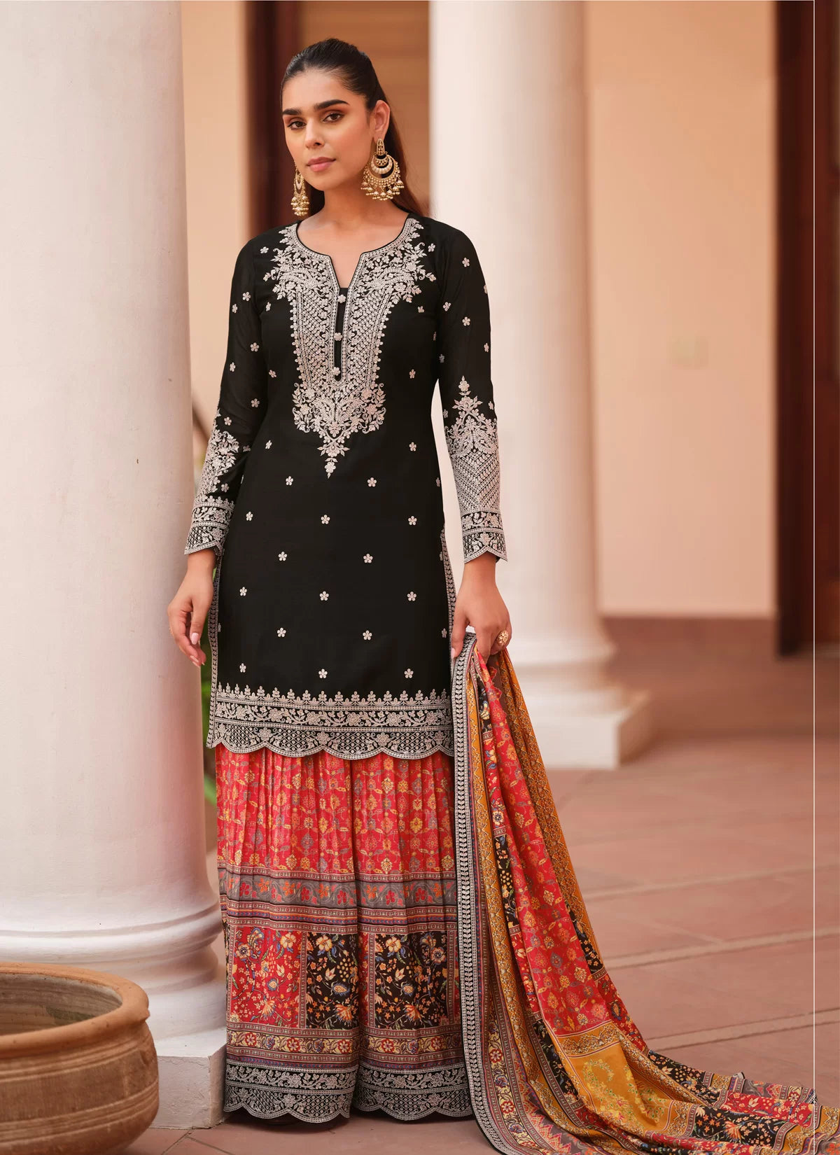 Black and Red Embroidered Sharara Suit