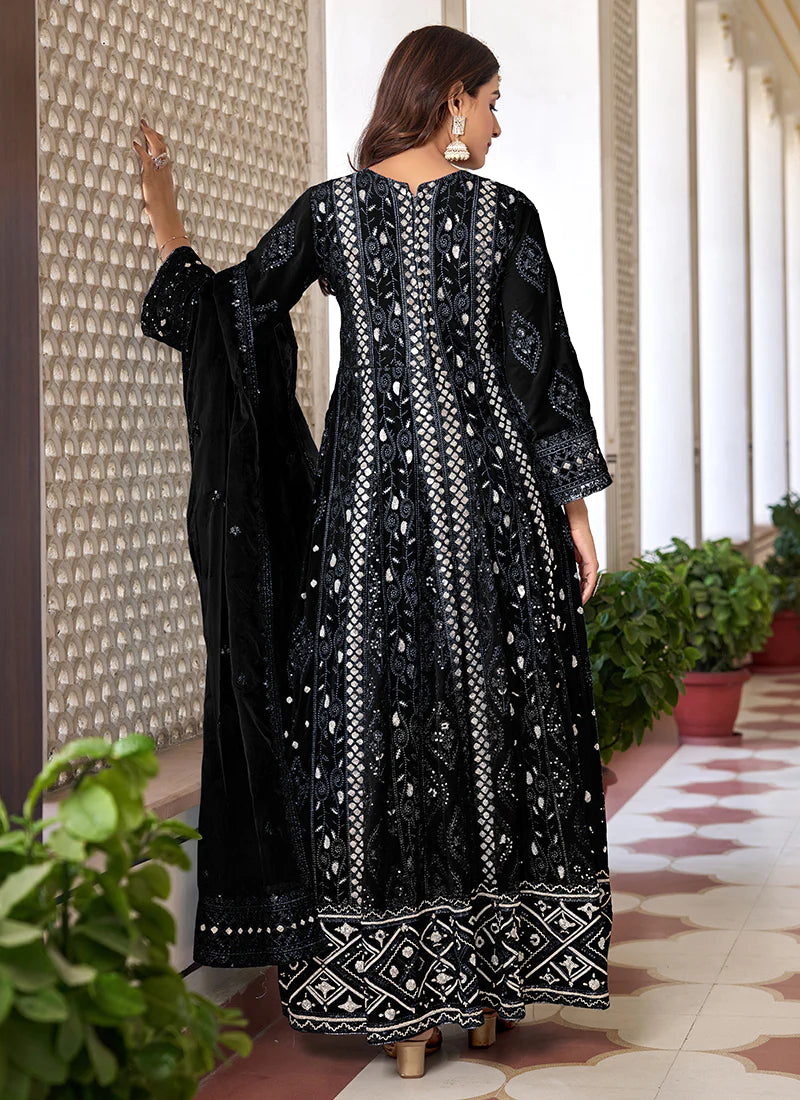 Black Embroidered Pant Style Anarkali features a georgette embroidered kameez paired with solid santoon silk pants. Comes with organza silk embroidered dupatta.