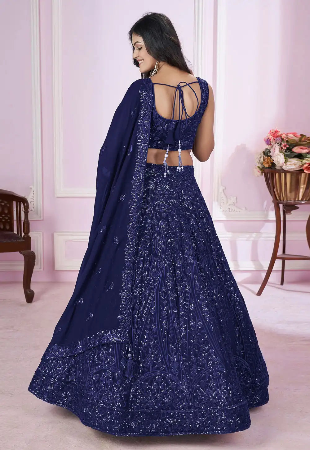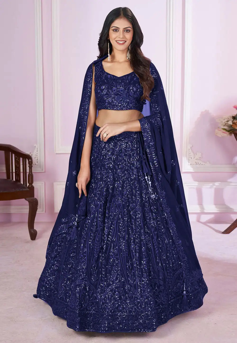 Elevate your style with our Blue Embroidered Lehenga Choli. This stunning ensemble features a beautifully embroidered georgette blouse and embroidered georgette lehenga, matched with a georgette dupatta. Embroidery is done using thread, sequins embroidery work. Perfect for any occasion, it's sure to make you stand out in the crowd.