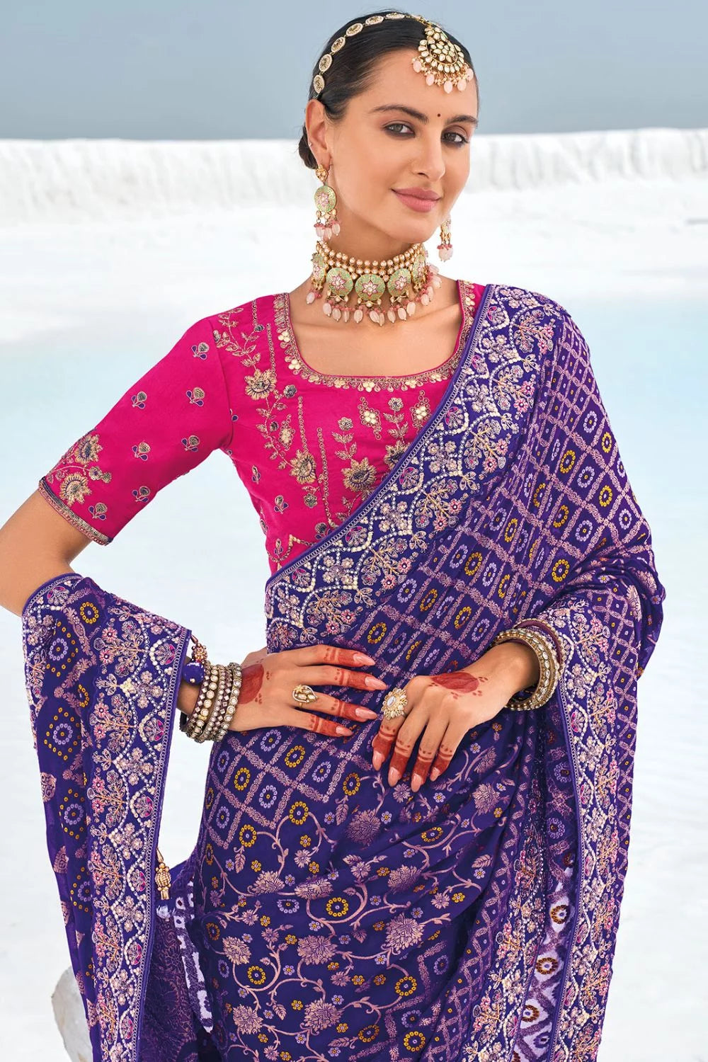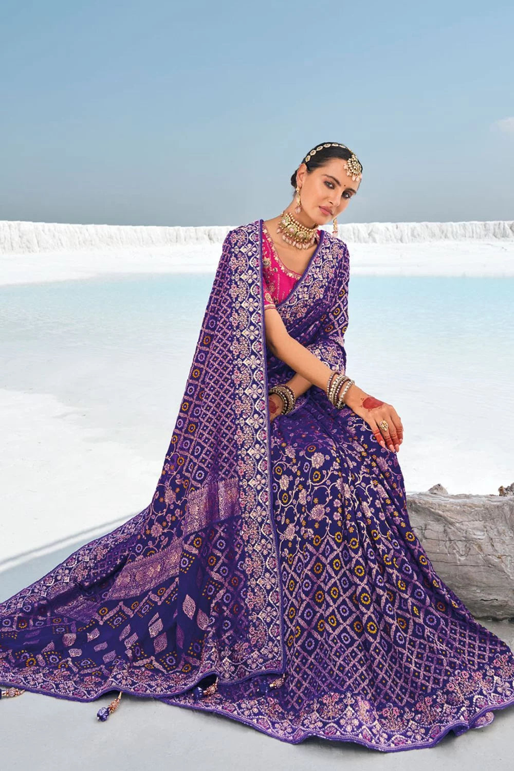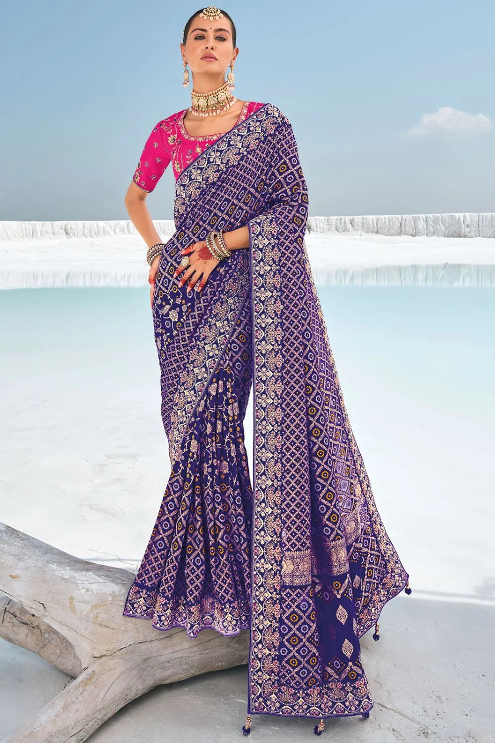 This Blue Embroidered Wedding/Festive Saree showcases a pure Georgette fabric embedded with intricate embroidery. Accompanied by a matching silk fabric blouse for a complete ensemble.