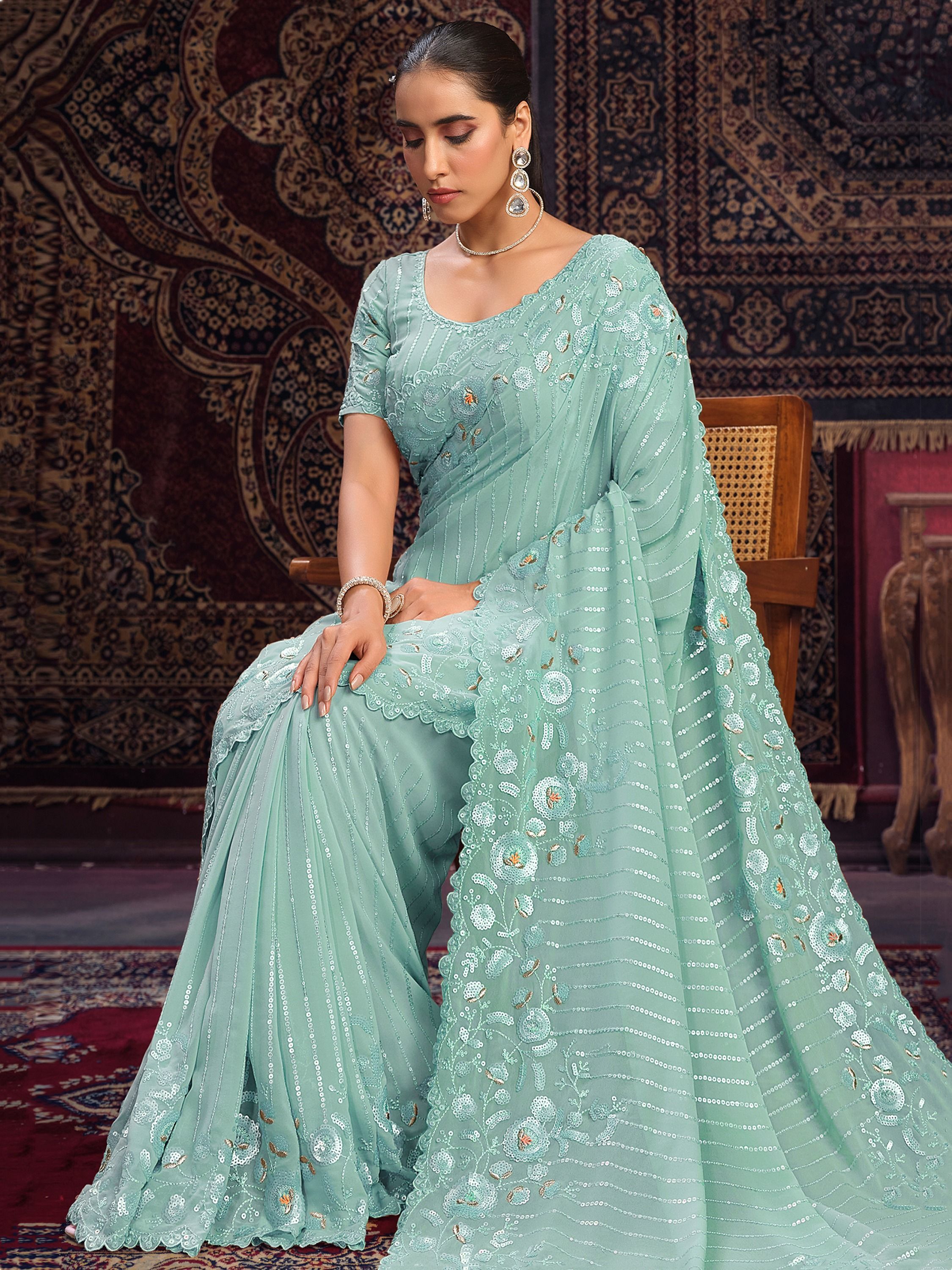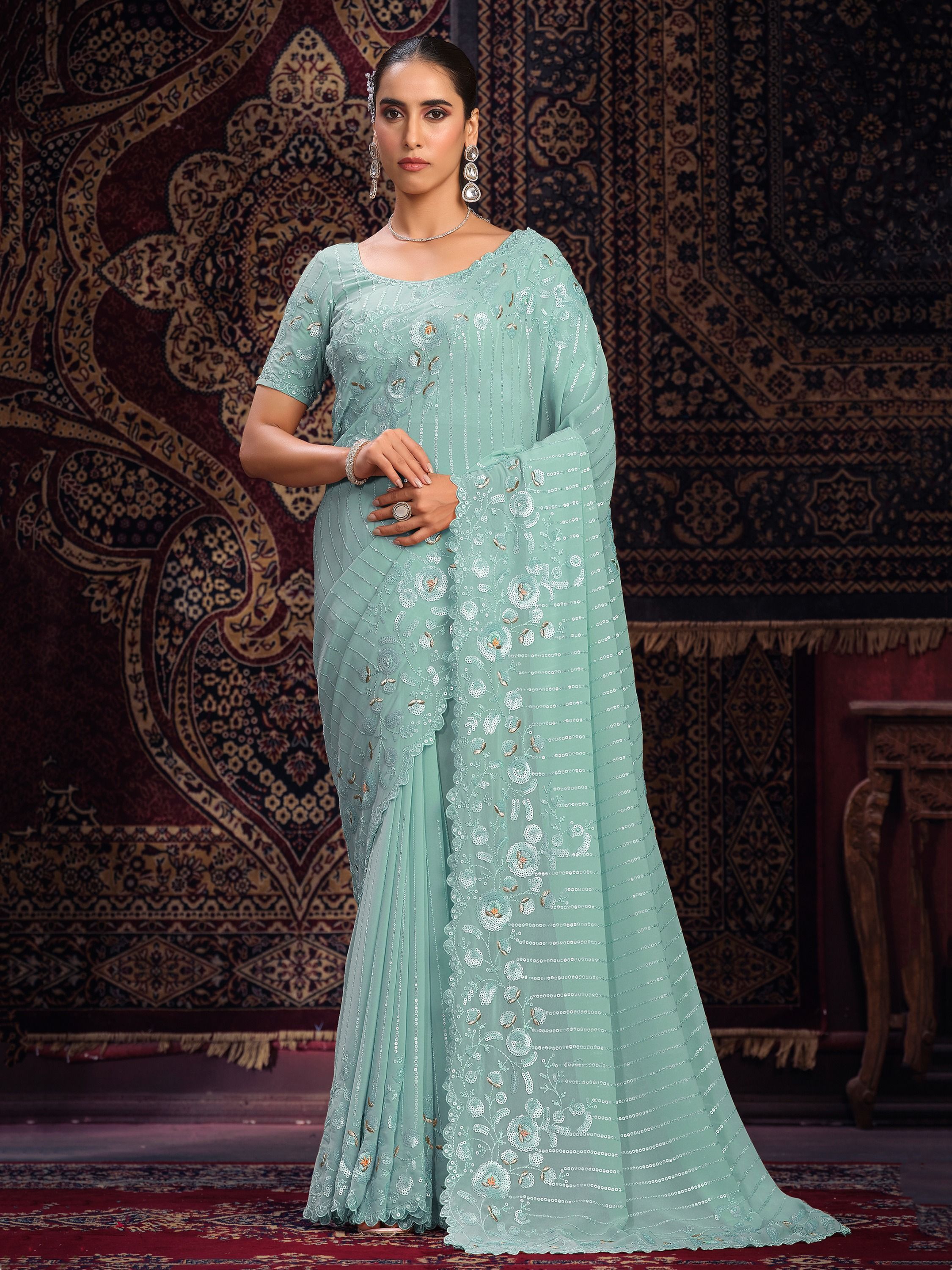 Blue Floral Embroidered Saree features a georgette saree with embroidery. Comes with georgette embroidered blouse. with sequins, thread, zari work.