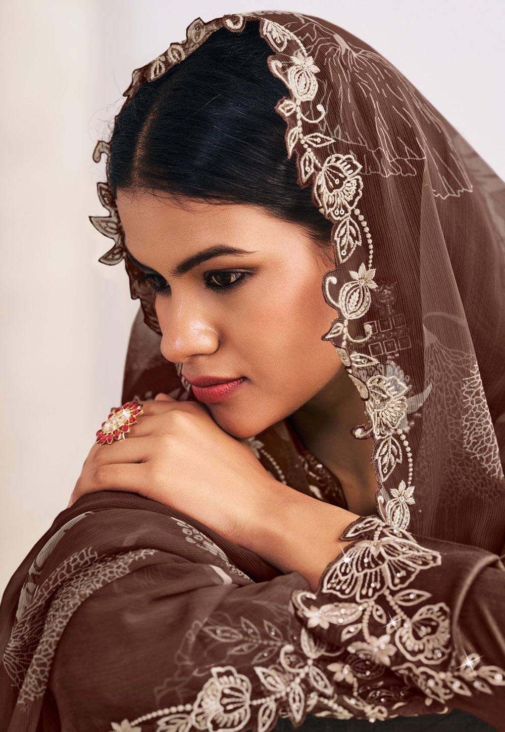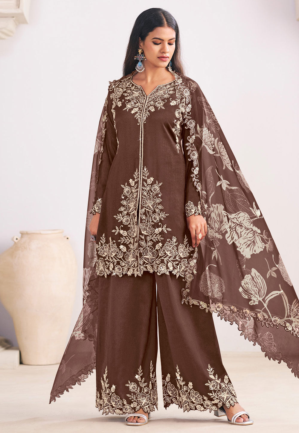 Brown Printed and Embroidered Palazzo Suit