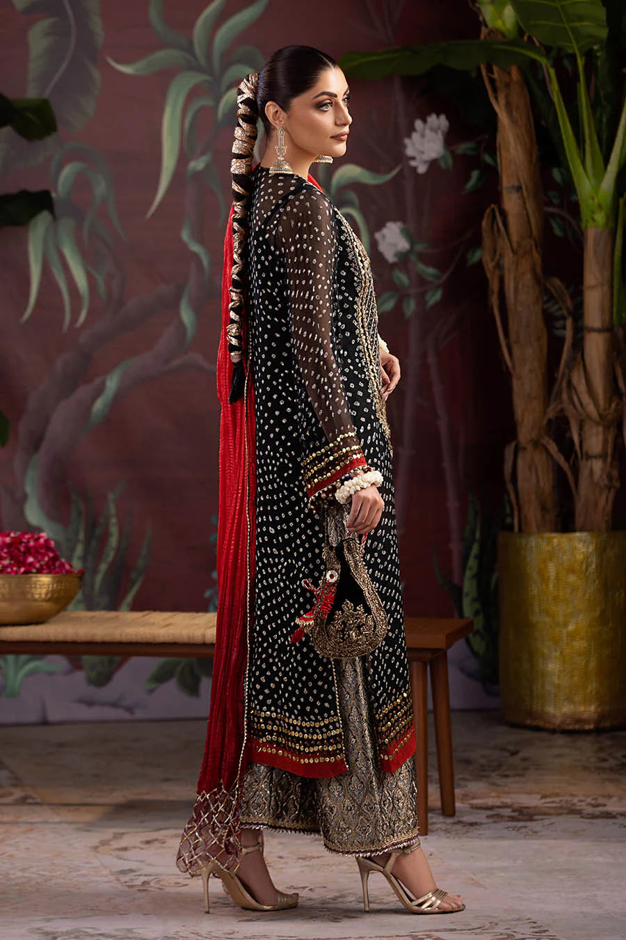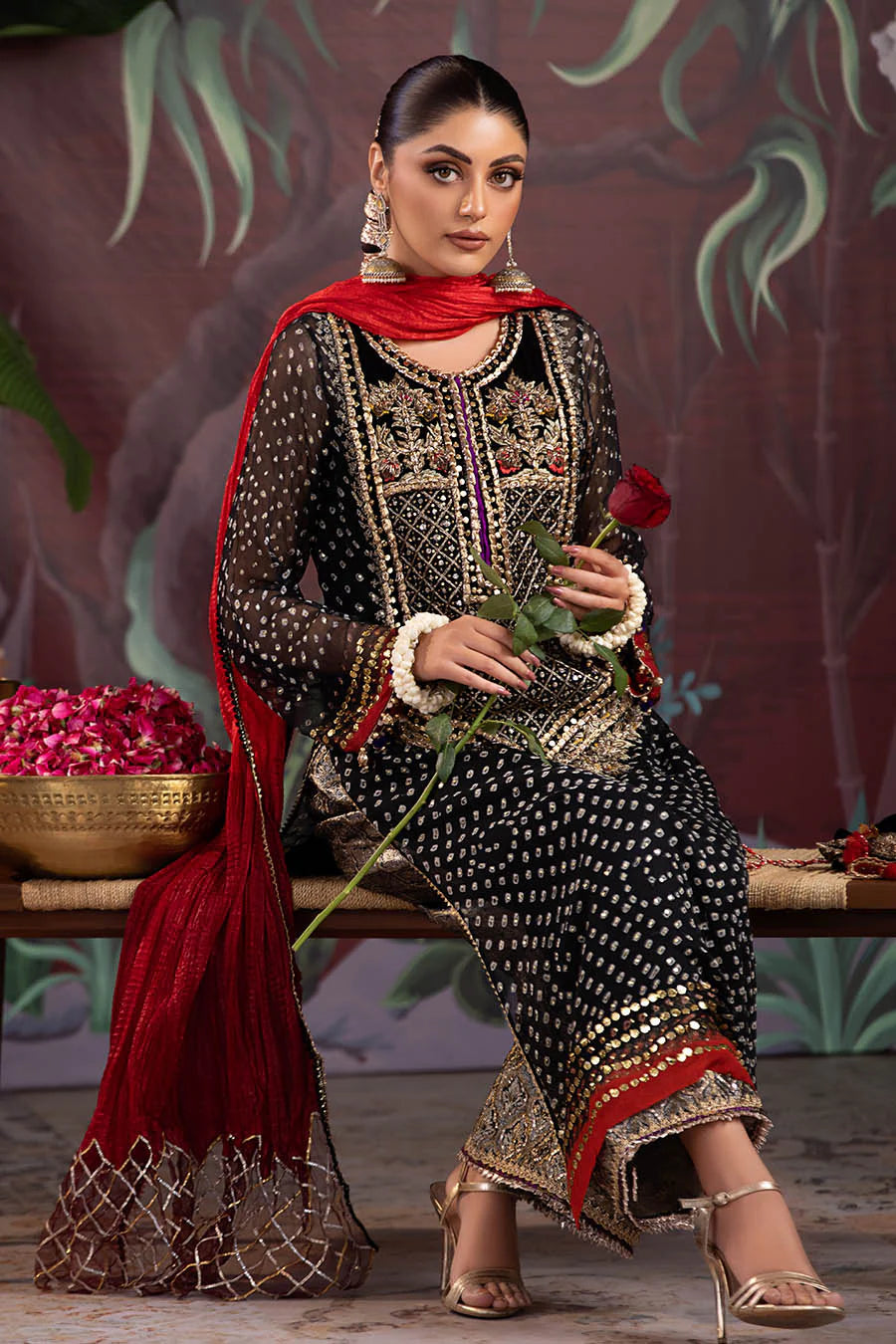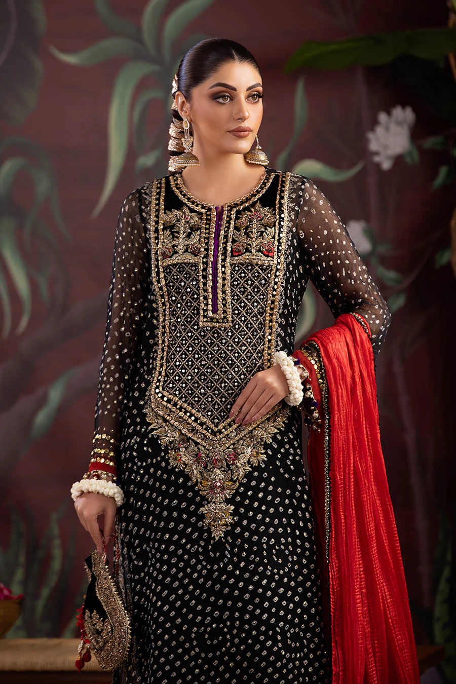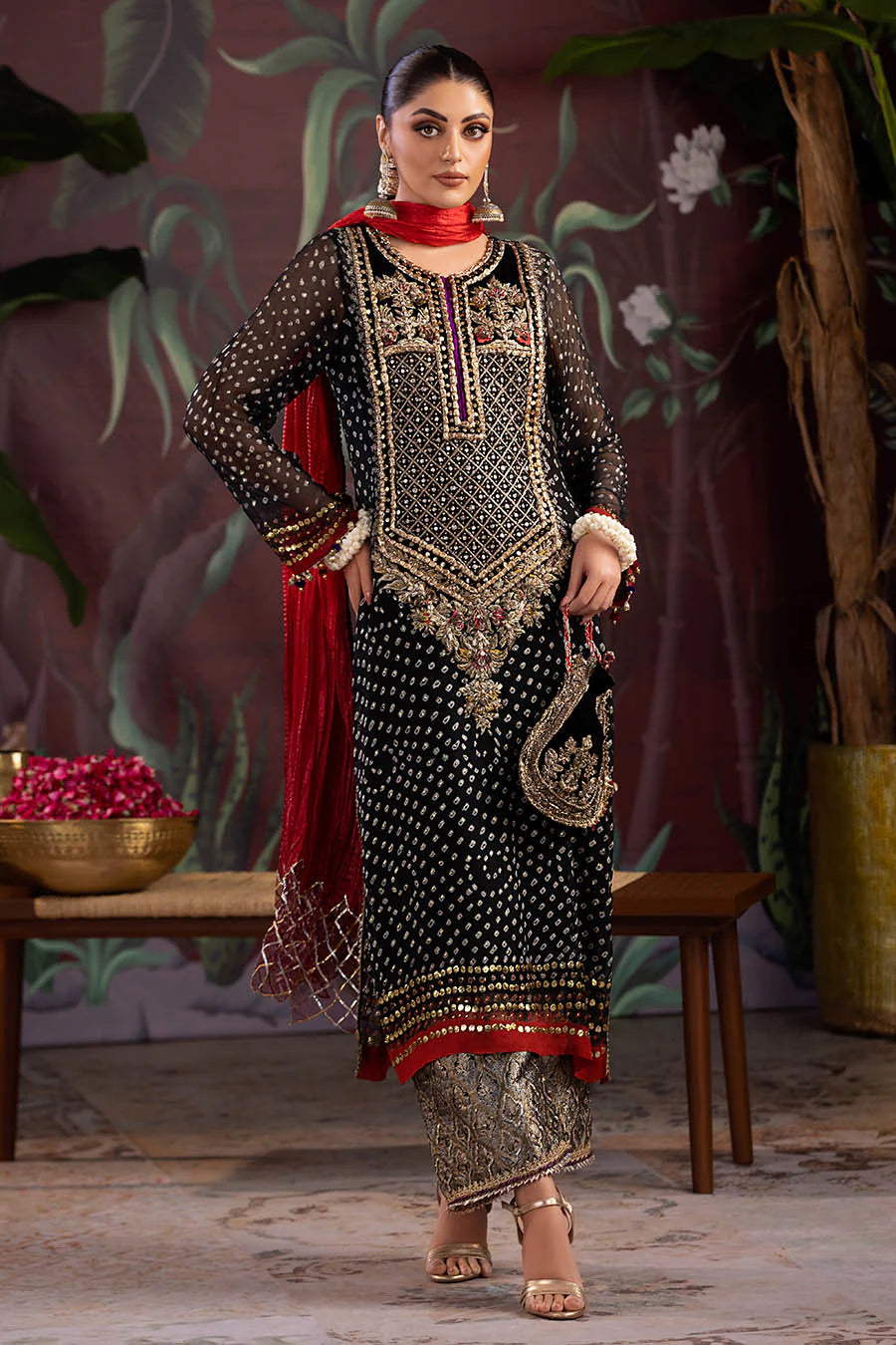 - Shirt: Chunnari Chiffon (Handmade) Mukesh, Kora, Dabka, Zardozi, Gotta, 3d work