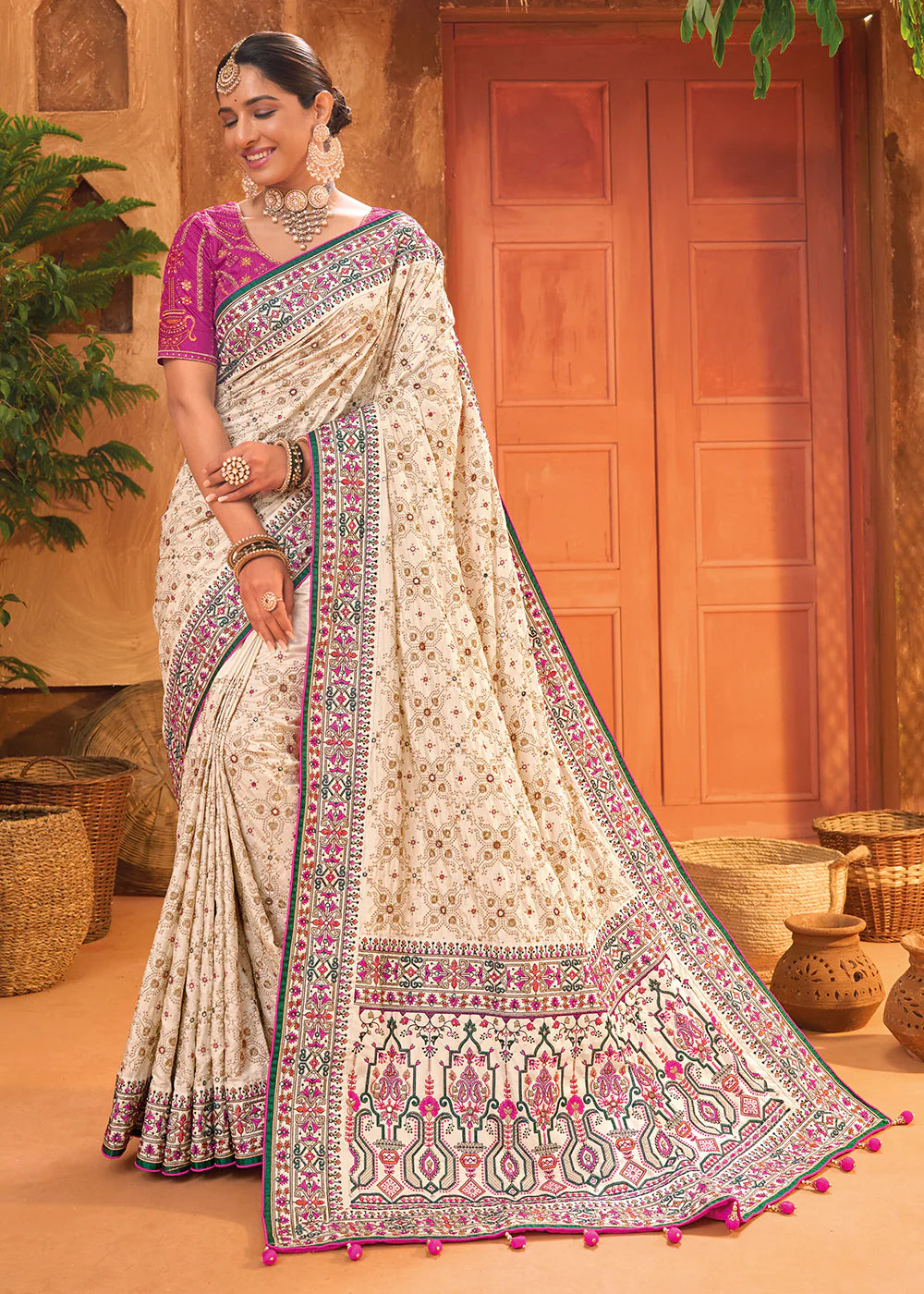 Indulge in pure elegance with our Cream Banarasi Silk Embroidered Saree. Adorned with exquisite kachhi work and embellished with sparkling diamonds, pearls, mirror and cut dana work, this saree is a perfect blend of traditional Indian craftsmanship and modern design. Make a statement at any occasion with this stunning piece.