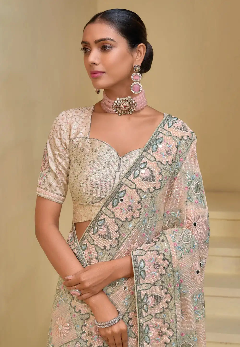 This Cream Embroidered Banarasi Saree showcases a pure banarasi tuscany fabric embedded with intricate embroidery. Accompanied by a matching silk fabric blouse for a complete ensemble.