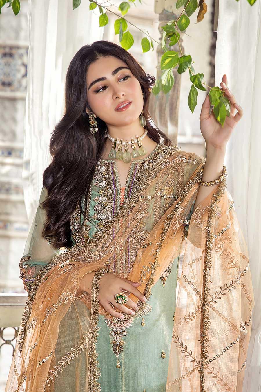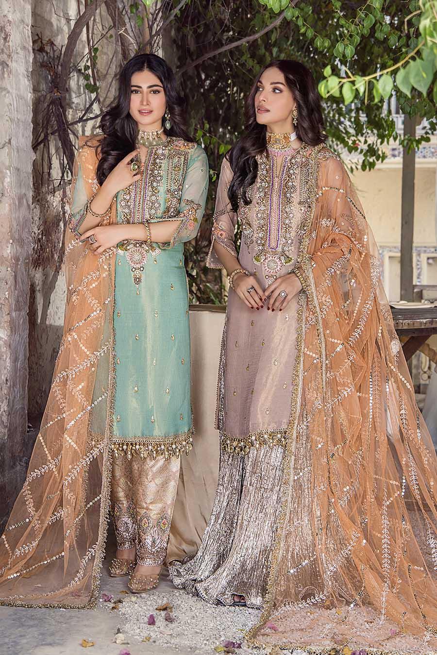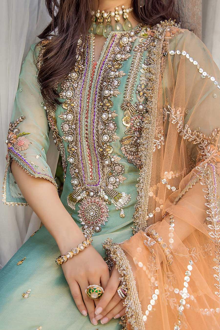 Step into luxury with our Pure Resham Mesuri ensemble! The hand-embroidered shirt, detailed with Kora Dabka, Zardozi, Stones, and hand-made tassels on Daman, is a true work of art. The Net Dupatta, featuring Embroidery, Gotta Work, and Sequins, adds a touch of glamour. Complete the look with a Jamawar Shalwar and a Pure Banarsi crushed-super fine quality Sharara, creating a fusion of tradition and modernity.