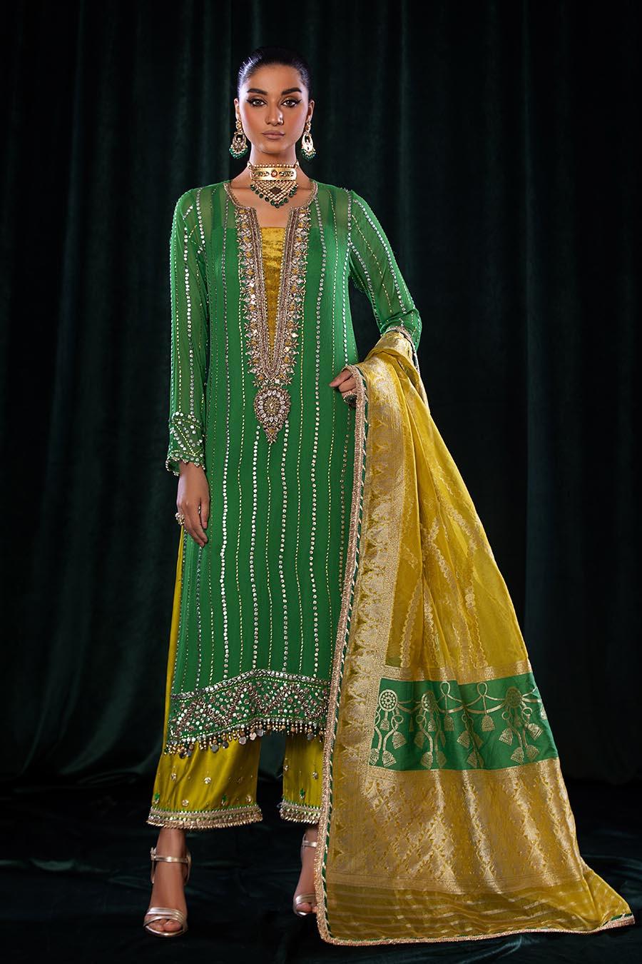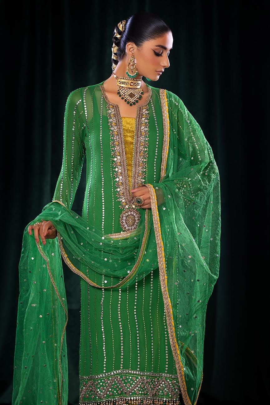 - Shirt: Pure Crinkle Chiffon (Hand Embroidered with Kora, Dabka, Gotta etc)