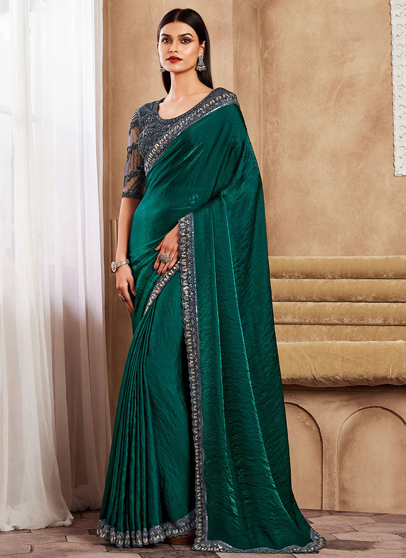 Dark Green Embroidered Saree features a silk saree with embroidery. Comes with silk embroidered blouse.