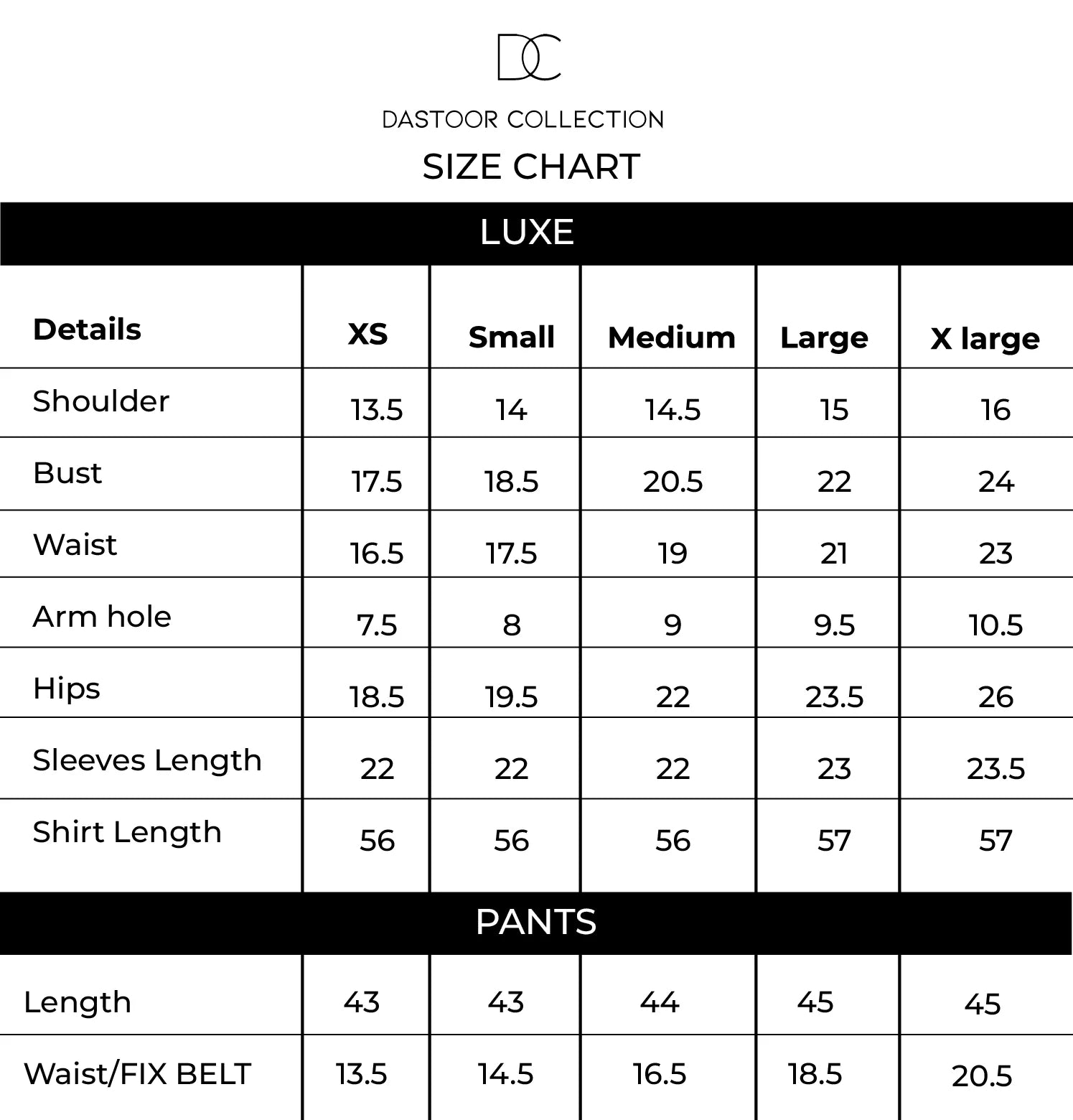 Luxe, A front-open long shirt paired with fluid sharara pants, designed to flow with confidence and grace. The silhouette is elevated with intricate hand embellishments: meticulously placed crystals, radiant Swarovski stones, and soft pearls that shimmer against every fold. From the clean cutline to the layered sparkle, every detail is crafted to embody modern luxury with a nod to timeless tradition!
