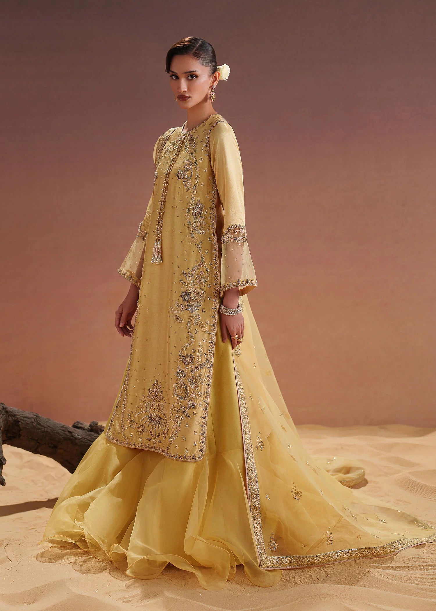 Amelie features a tissue silk shirt finished with delicate embroidery and soft embellishments. Paired with a matching tissue silk ruffled sharara, the silhouette is fluid, lightweight, and designed to move effortlessly. Elegant, refined, and timeless.
