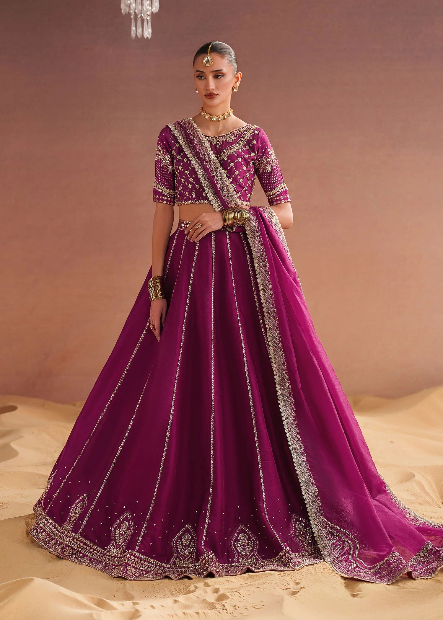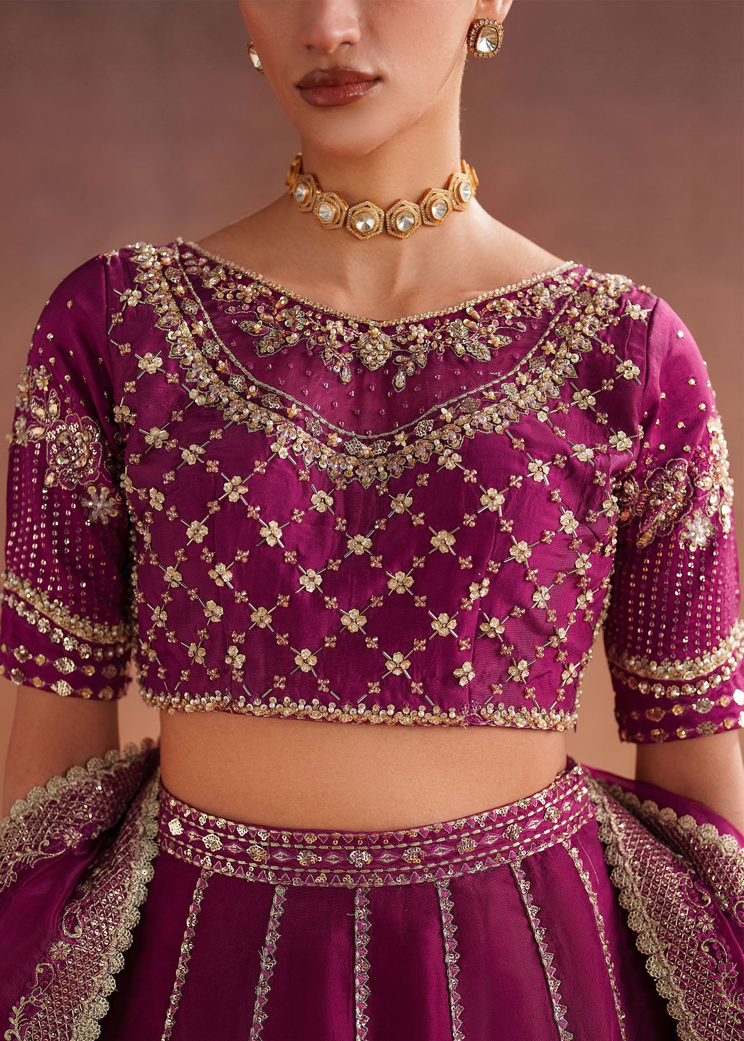 This Burgundy outfit features a Blouse and Lehnga set in Tissue silk korean fabric, adorned with intricate embroidery and sequin , beads, saroski, crystals, pearls paired with an Organza Embroidered dupatta. Perfect for those who love understated luxury and elegance!