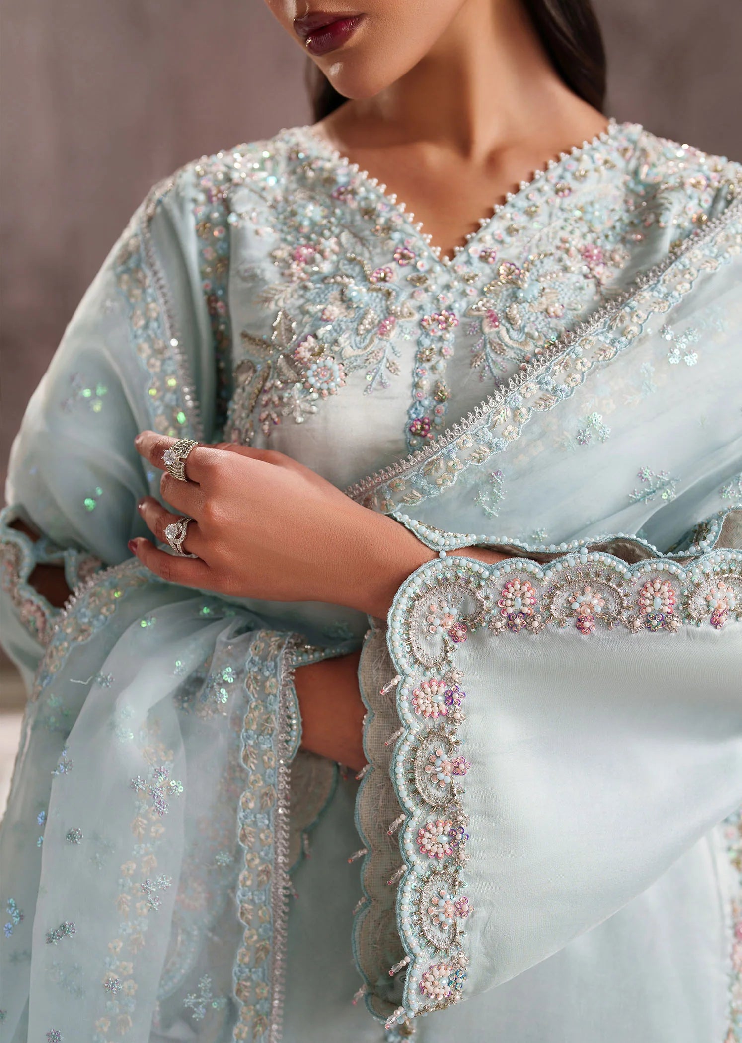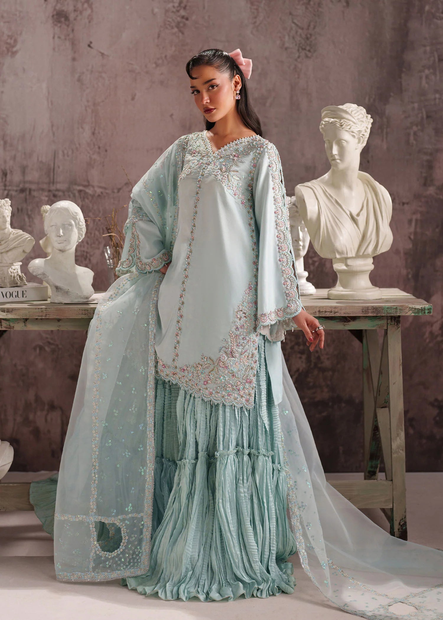Crafted on a serene blue base, this outfit is designed in luxurious tissue silk and elevated with delicate embroidery, soft embellishments, and subtle pearl detailing. Gentle hints of pink add a refined warmth, creating an effortless harmony that feels elegant without trying too hard. Timeless, graceful, and memorable, this piece is made to solve that “nothing to wear” moment and is a personal favorite of the designer.