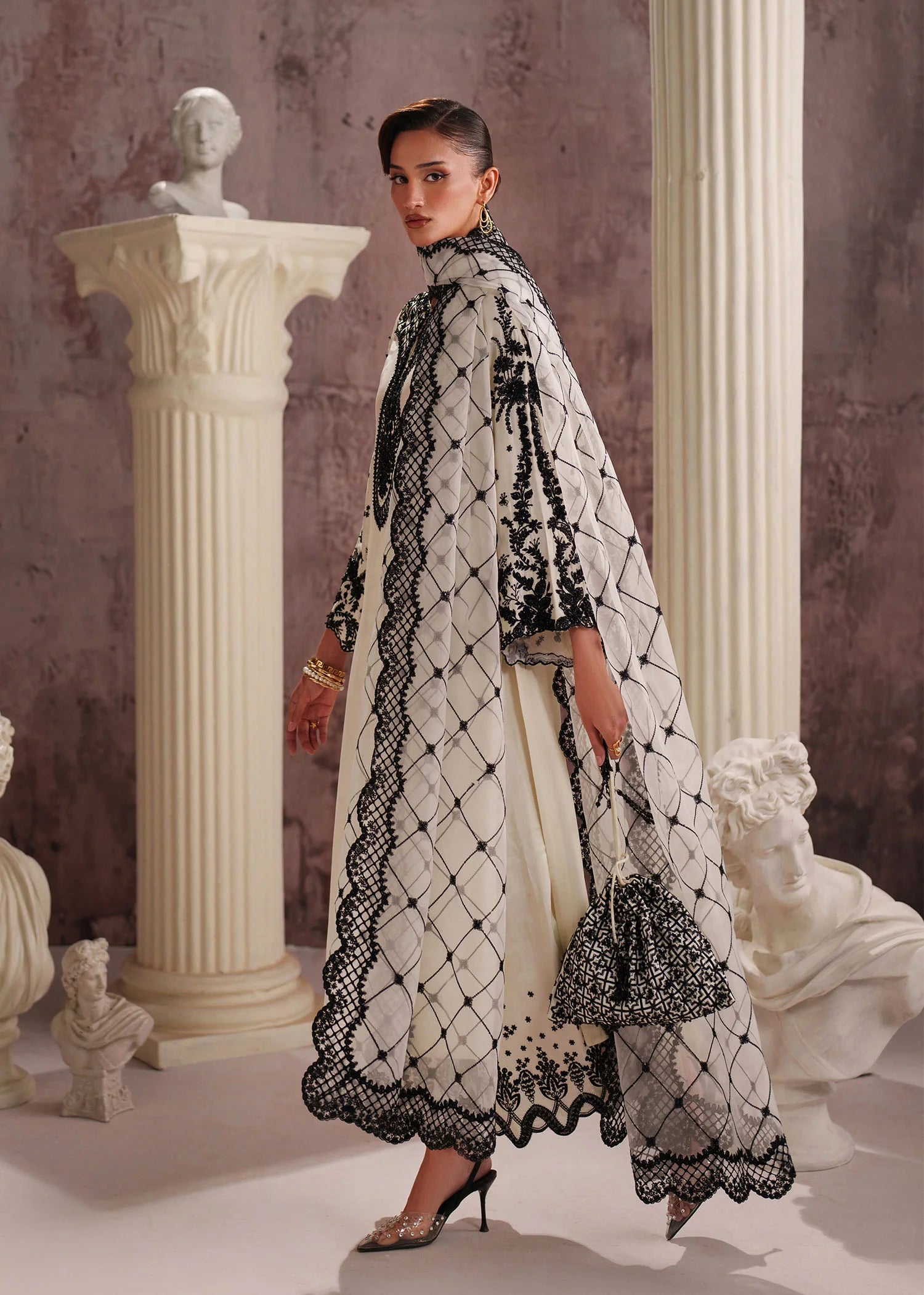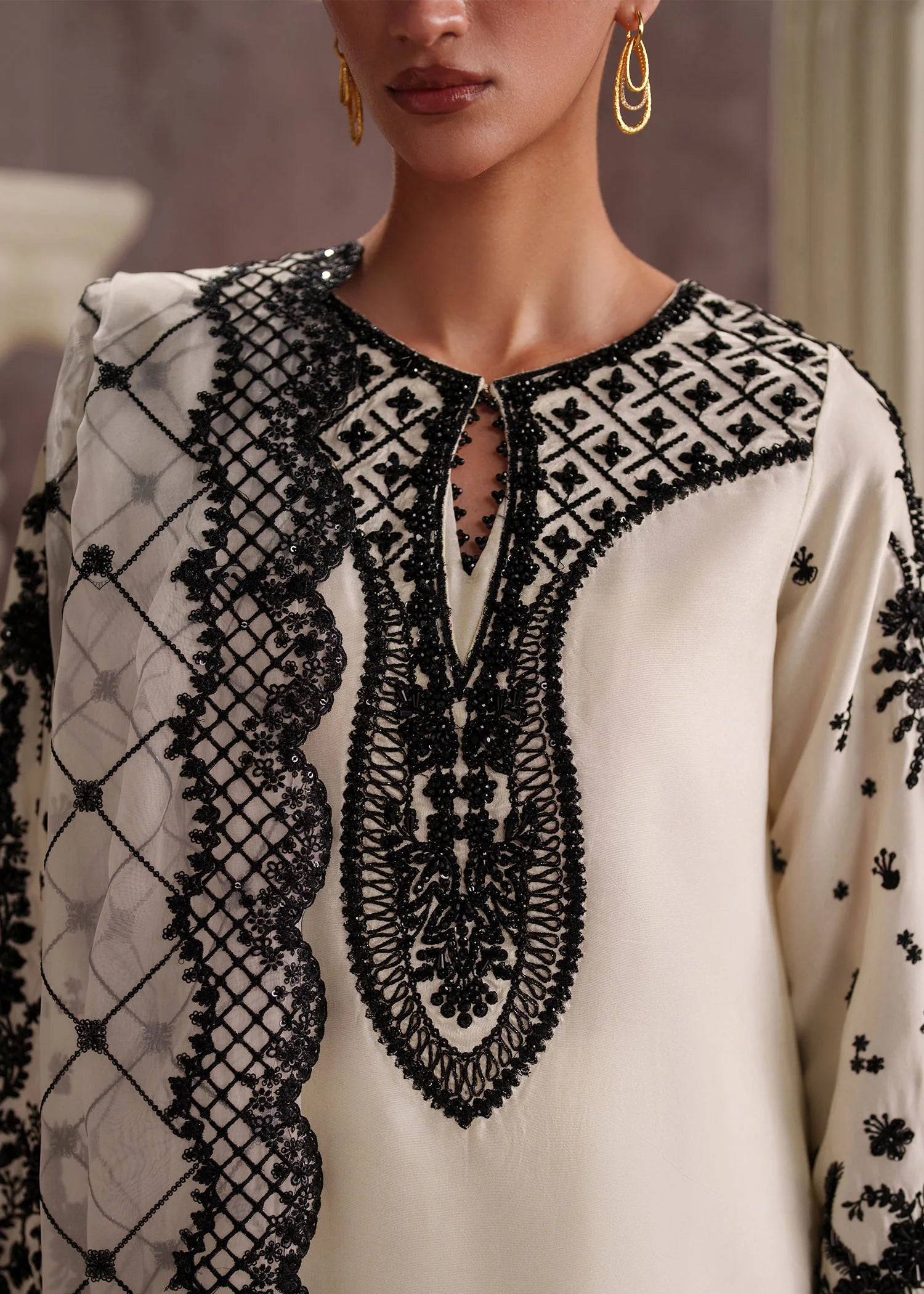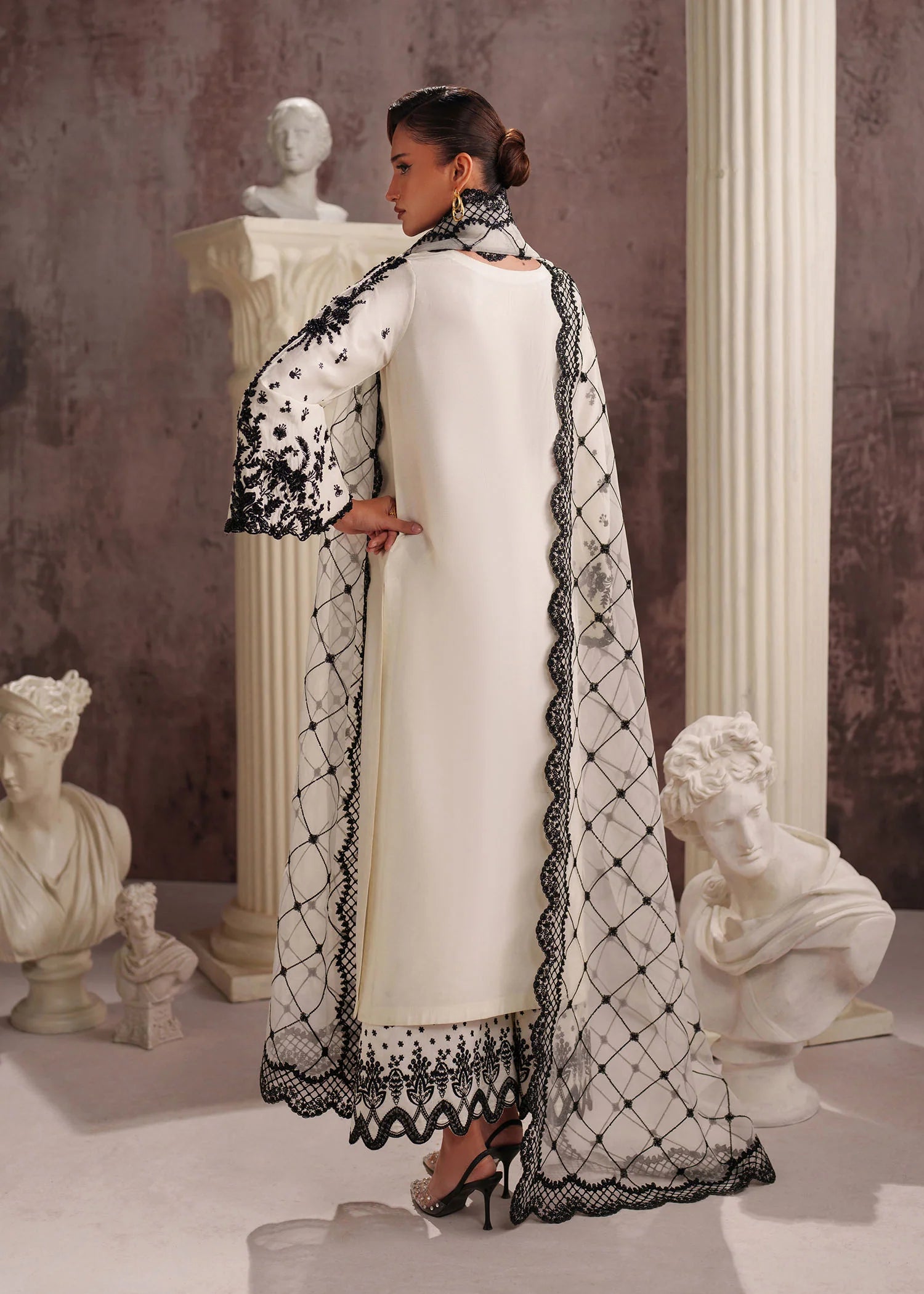 A modern classic in White Tissue Silk (Korean), this set offers a luxurious feel and impeccable drape. The shirt is embroidered with beautiful hand Embellishments and pants is embroidered palazzo are paired with a crisp organza Embroidered dupatta, blending contemporary style with traditional elegance.