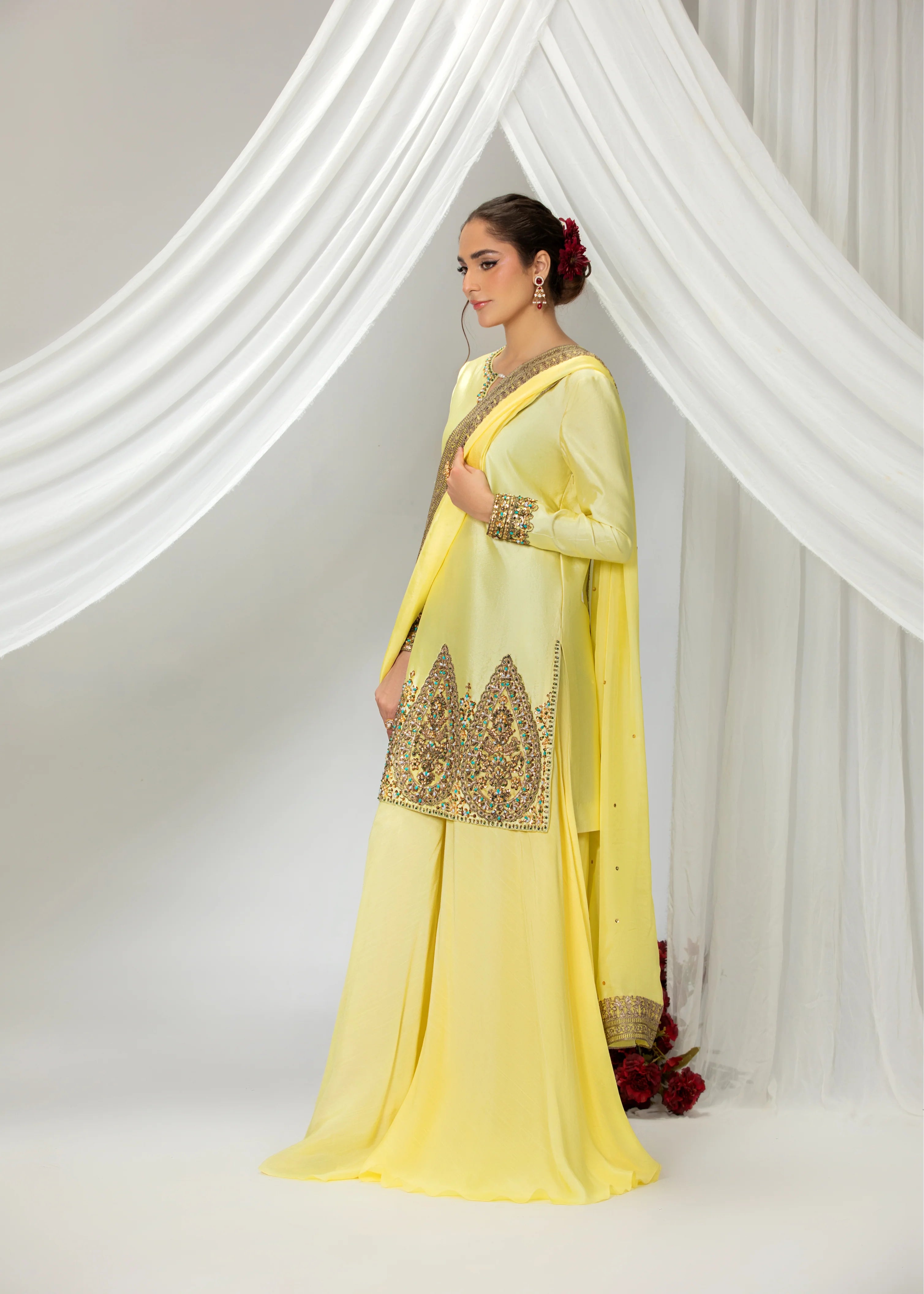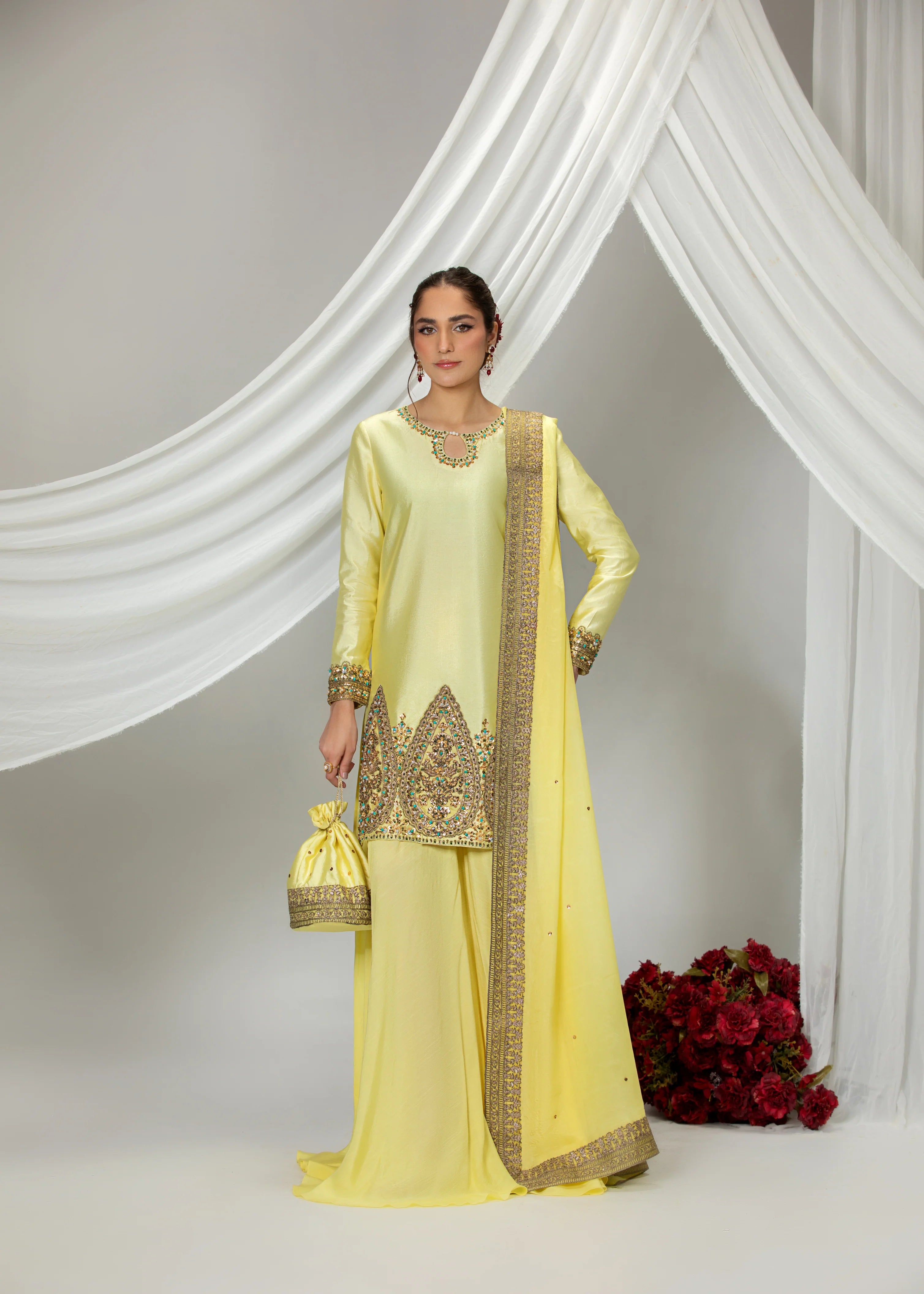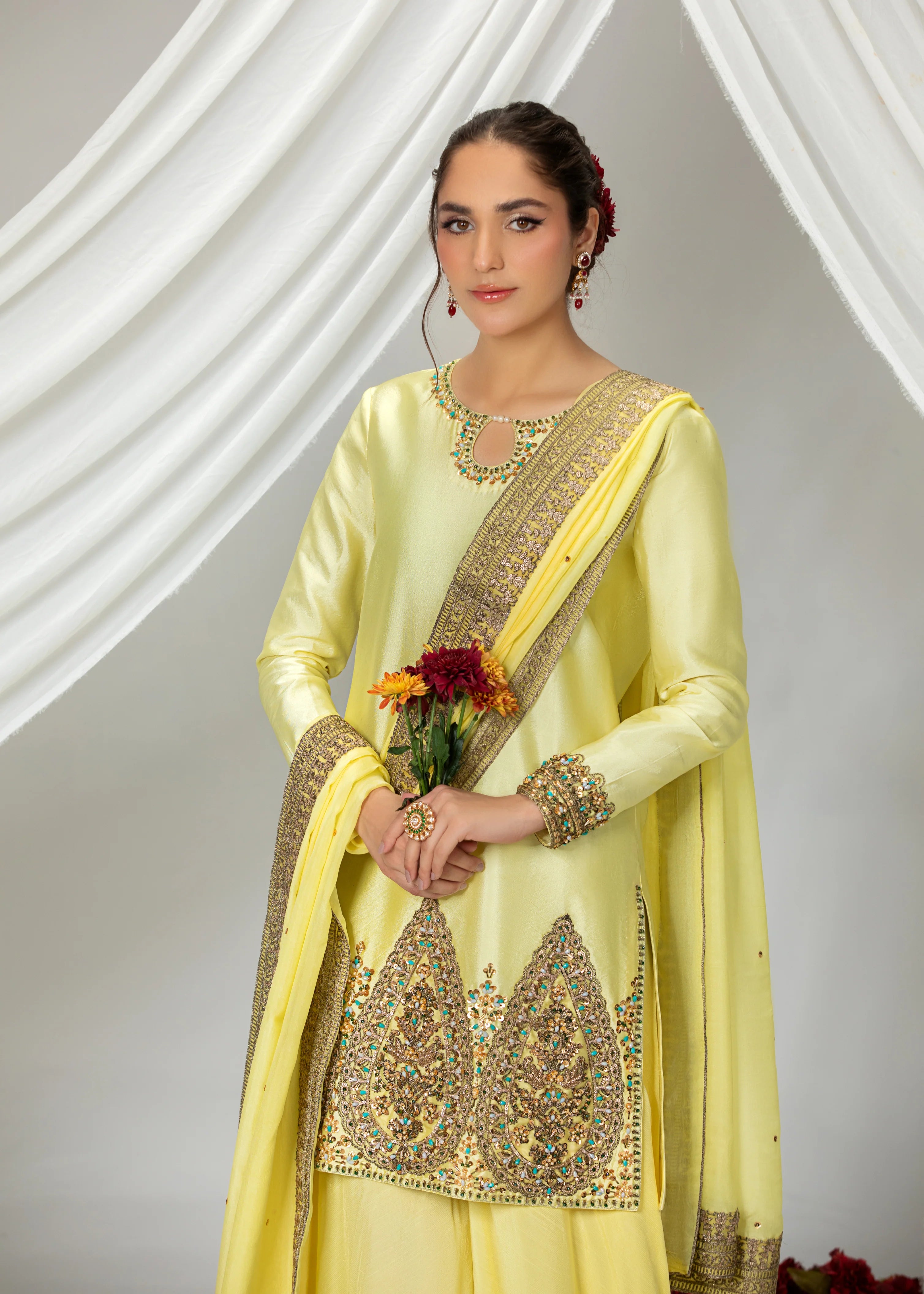 Introducing Huda, a stunning creation, showcasing the intricate beauty of hand embellishments. Delicate naqshi and dabka work are complemented by shimmering sequins, radiant multicoloured pearls, while machine embroidery adds a soft, elegant touch. This masterpiece combines tradition with modern elegance, making Huda the perfect choice for those seeking a graceful, statement look for special occasions.