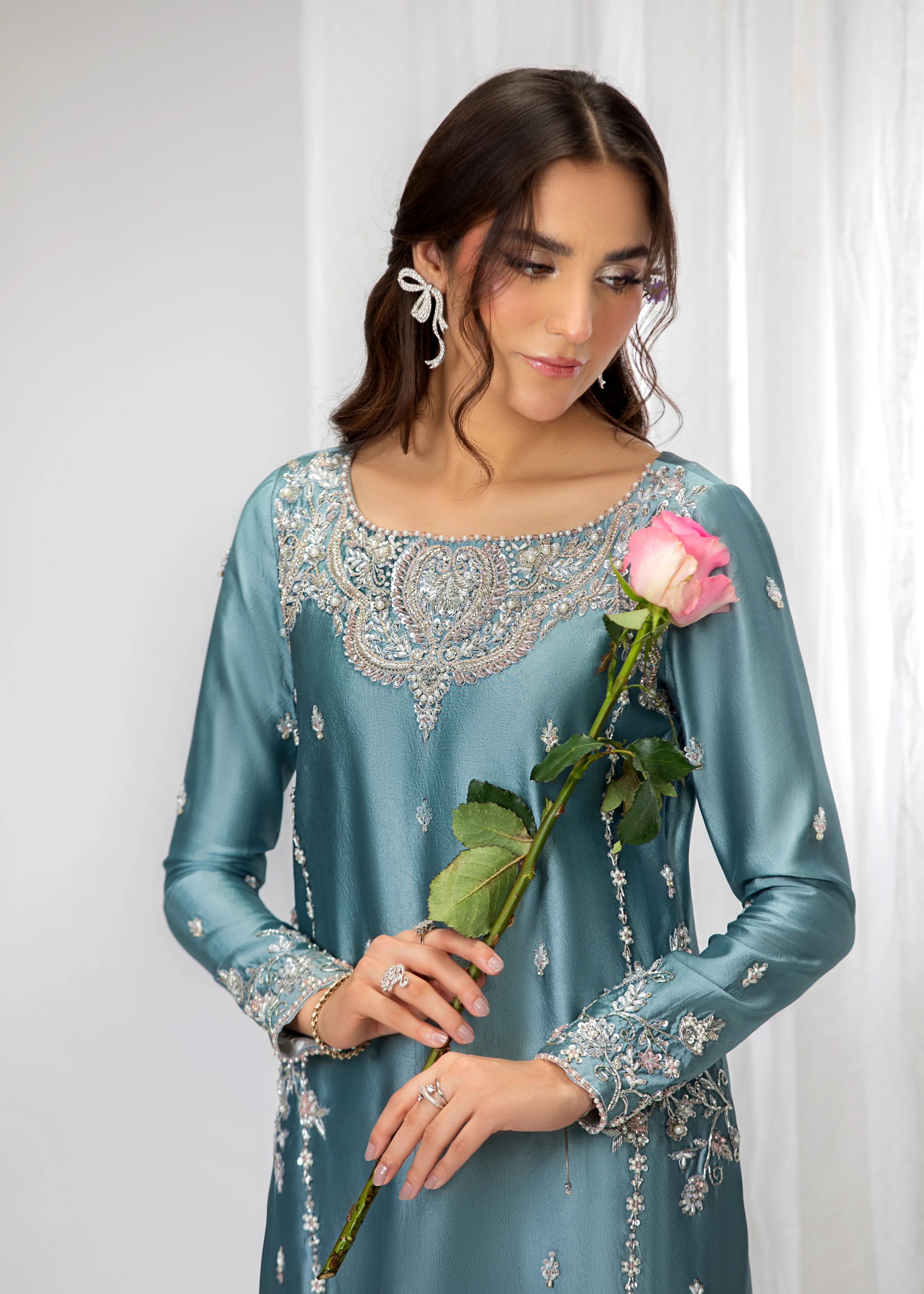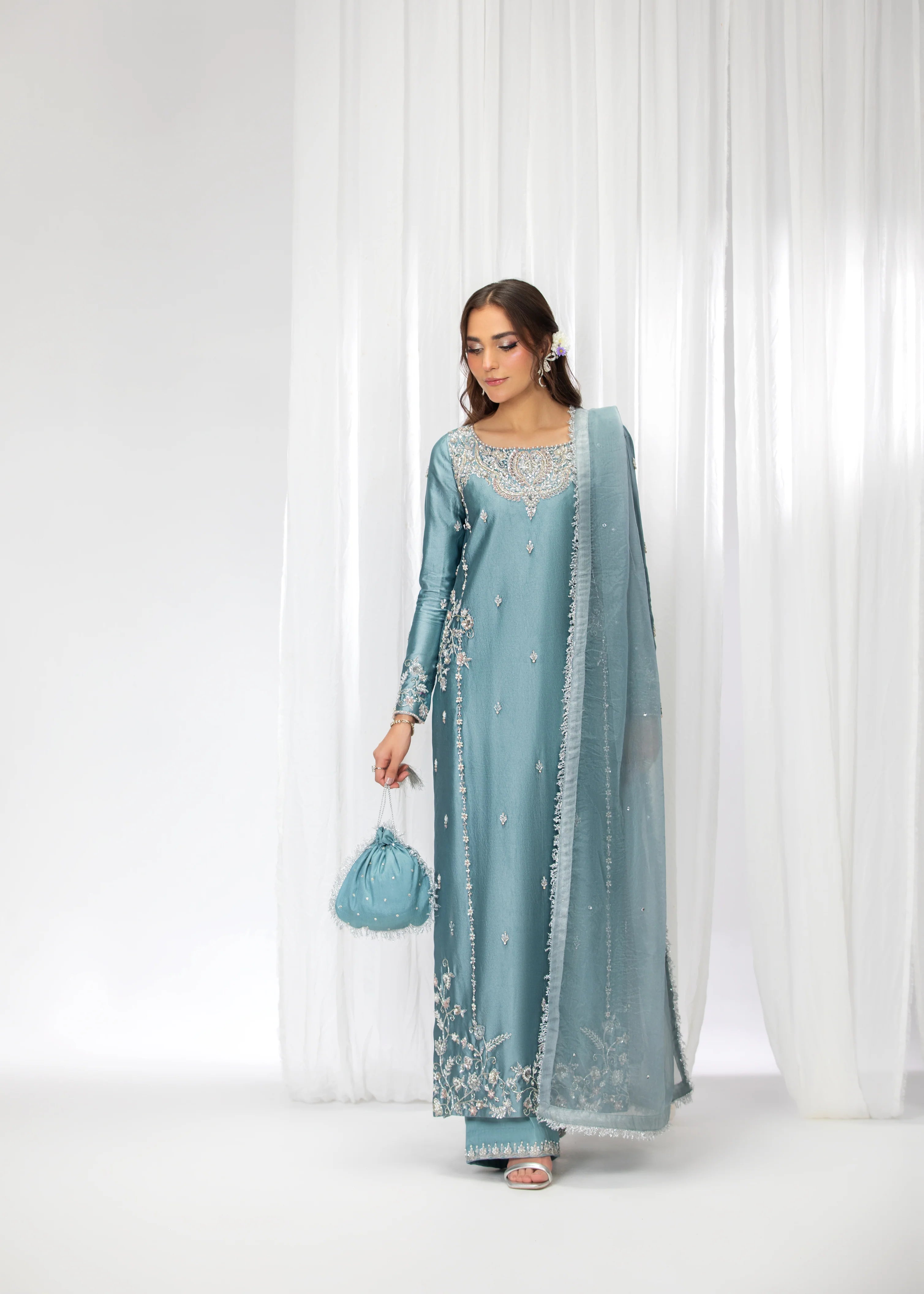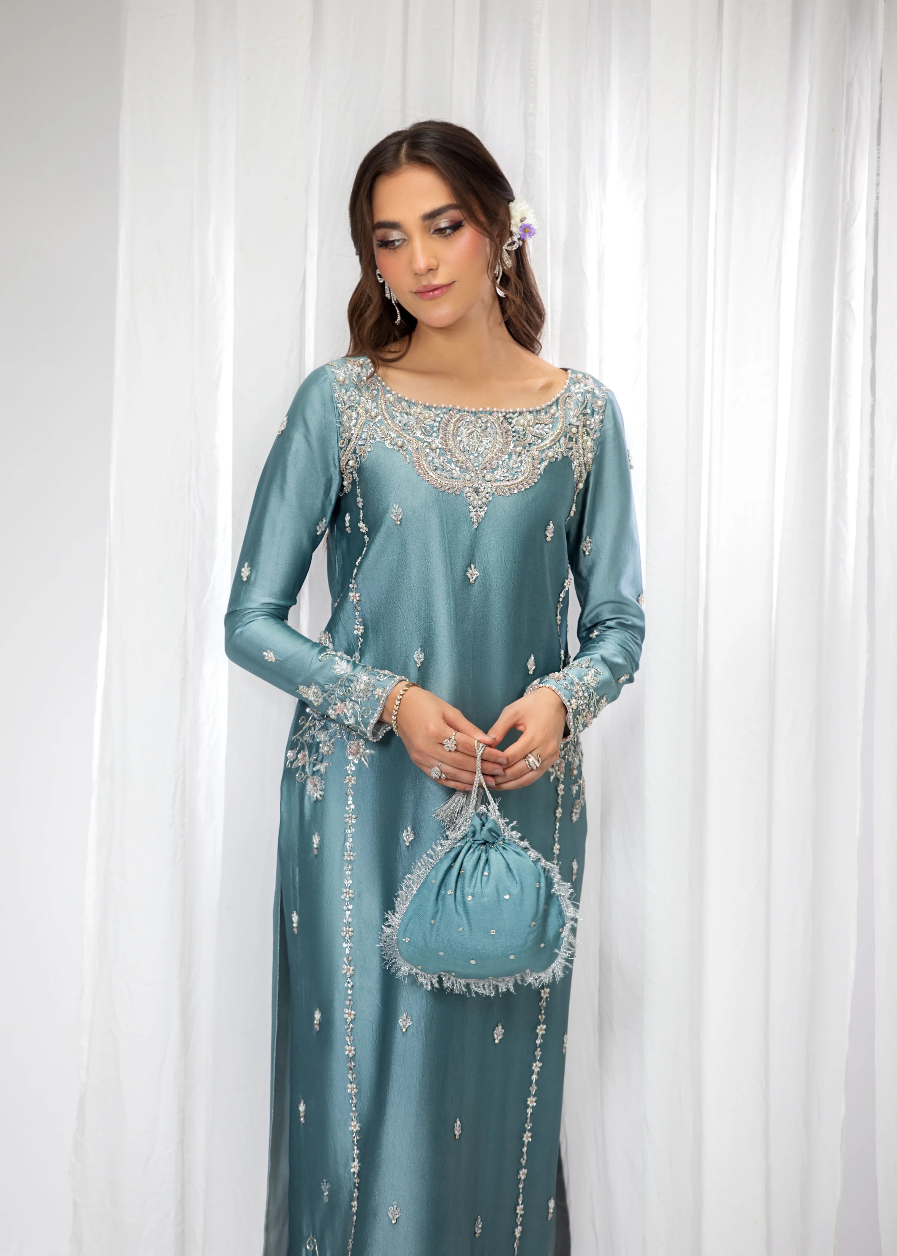Introducing Zyra, a dazzling creation that exudes grace and refinement. Meticulously adorned with intricate naqshi and dabka, Zyra is further embellished with shimmering sequins and pearls. The design is completed with sparkling rhinestones, adding a touch of brilliance to this exquisite ensemble. Zyra is the epitome of timeless elegance, perfect for making a statement at any special occasion