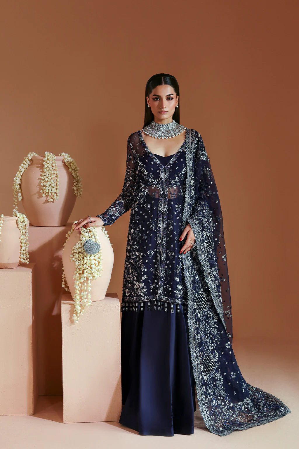 Elysian — a vision of grace in a rich deep blue hue. Adorned with intricate embroidery and delicate embellishments, it reflects timeless sophistication and serene elegance. A masterpiece crafted for moments that deserve to be unforgettable.