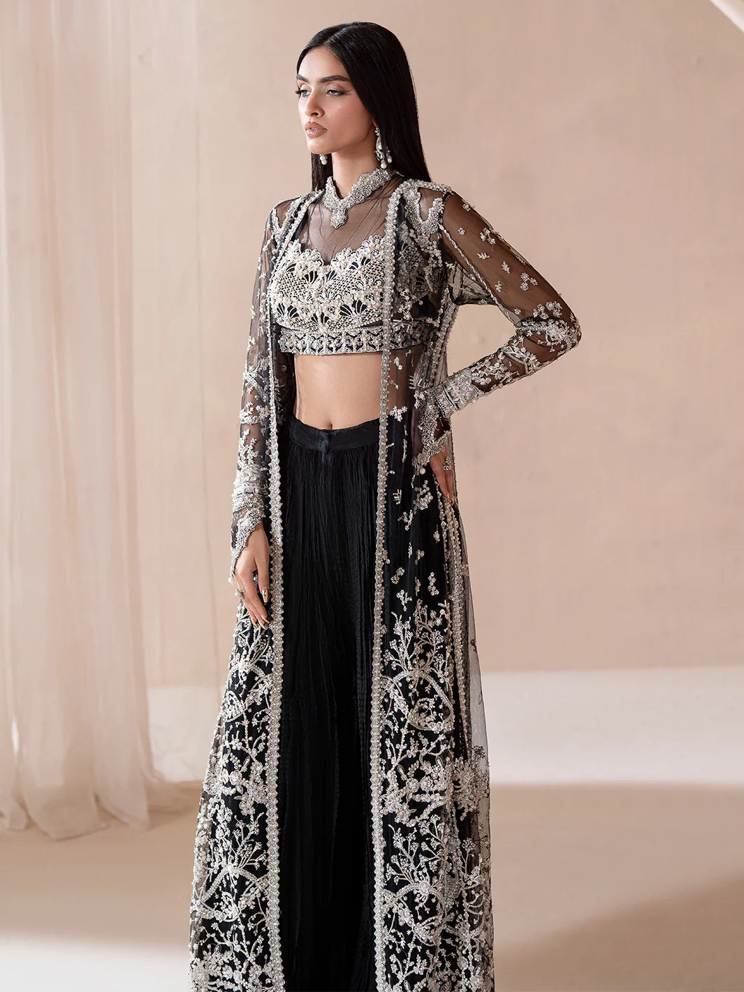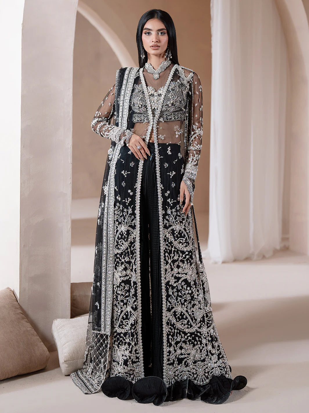 Ardeur the deep allure of black emerges bold, magnetic, and breathtakingly refined. The front-open jacket with a side slit unveils an intricately embellished inner tube blouse, adorned with pearls, crystals, sequins, and cut dana, framing a uniquely detailed neckline. Paired with a flowing crushed sharara and a diaphanous dupatta, the ensemble captures both grace and grandeur. Embellished with threadwork, tilla, batki, pearls, crystals, and sequins, it mirrors the shimmer of starlit nights. A masterpiece of contrast and charisma,Ardeur is strength woven into elegance an ode to the power of poise.