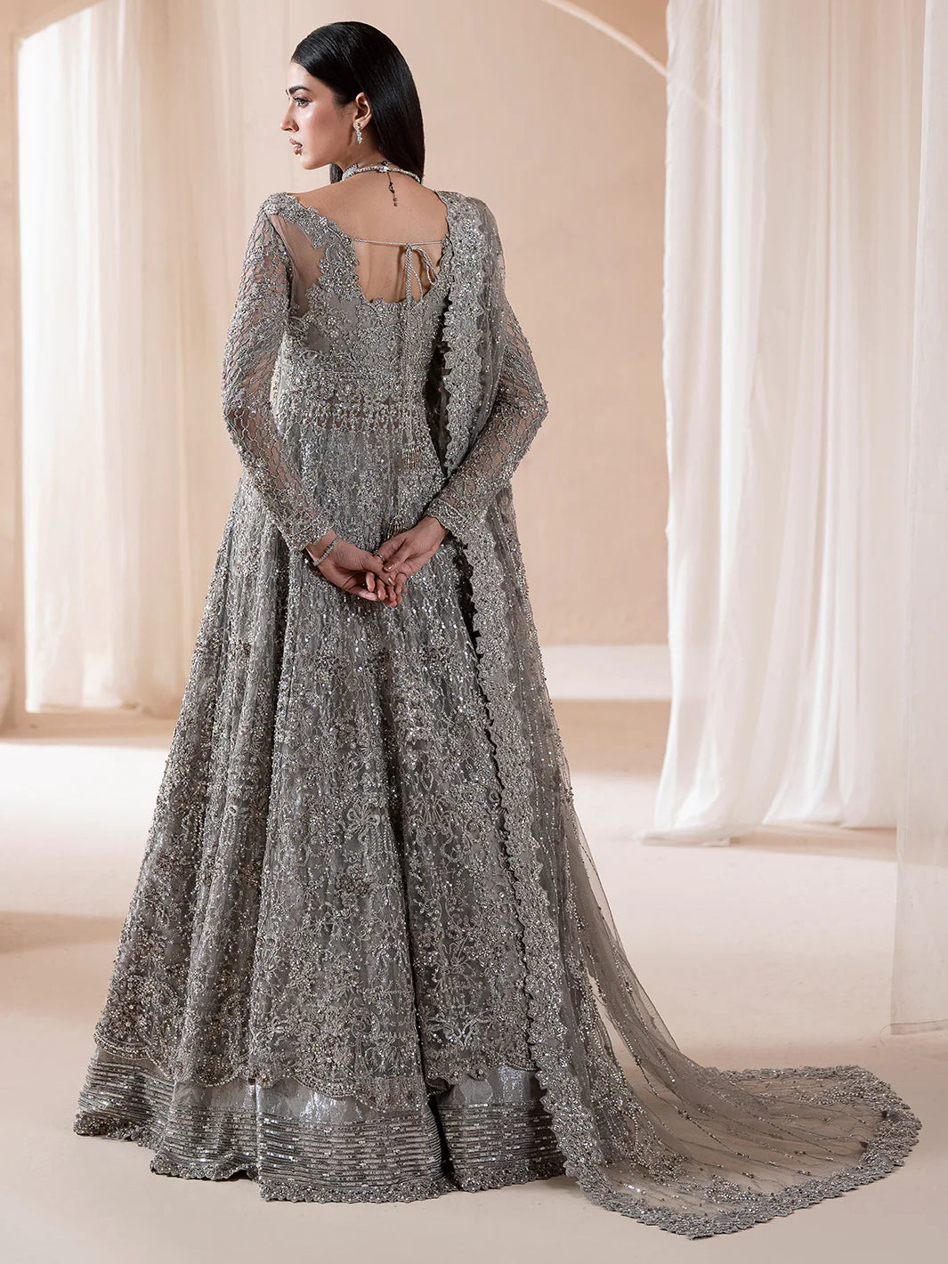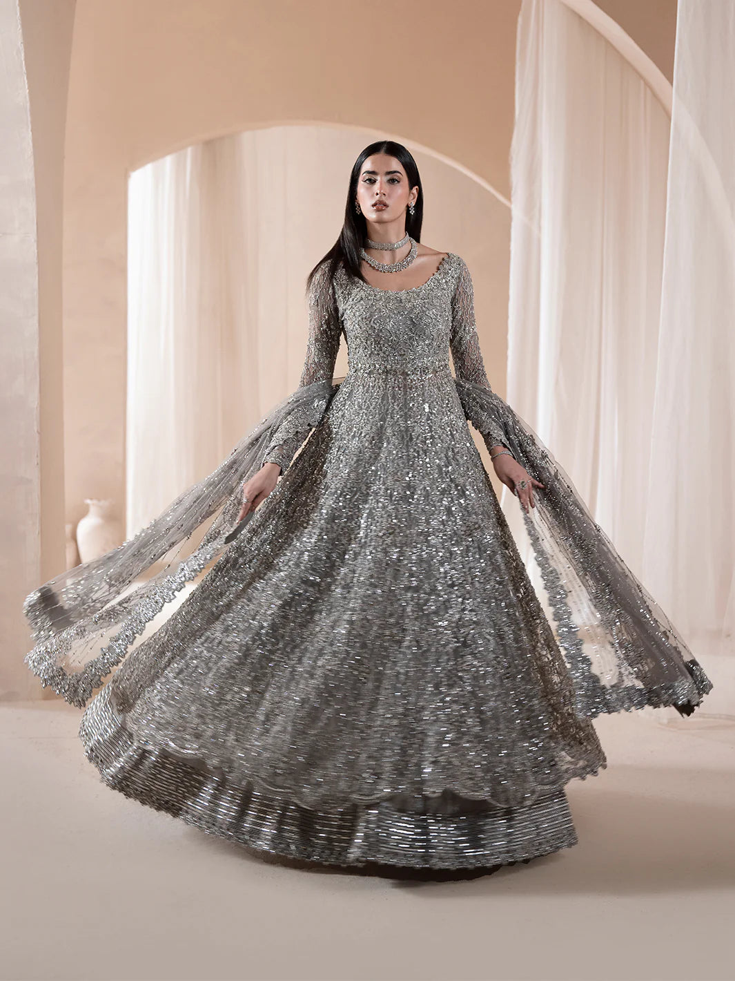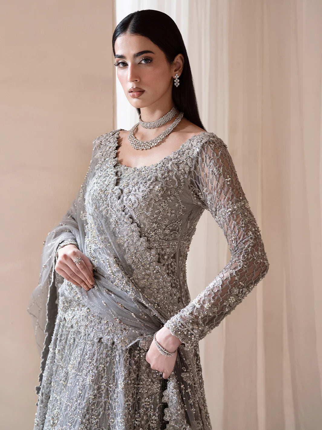 Astre draped in the grandeur of dark grey, embodies an aura of regal poise. Its lavishly embellished pishwas, paired with an opulent lehnga and diaphanous dupatta, evokes imperial allure. Intricate thread work, tilla, cut dana, batki, pearls, crystals, and sequins illuminate its surface with quiet brilliance.A masterpiece of strength and sophistication, Astre is where elegance reigns supreme.