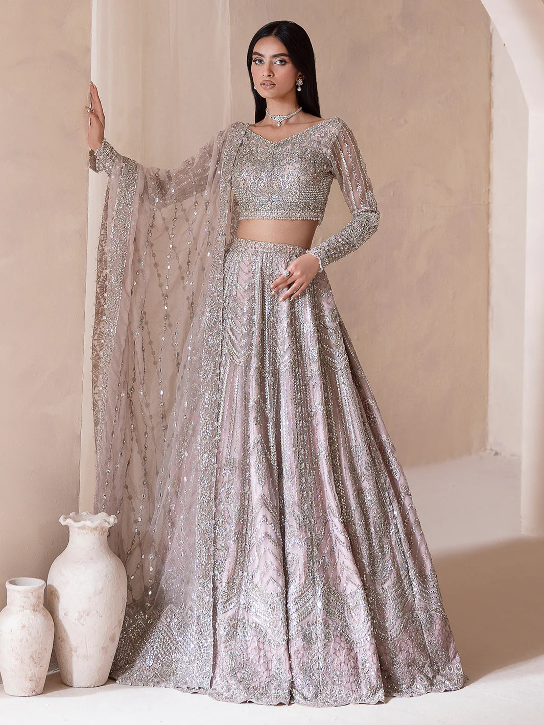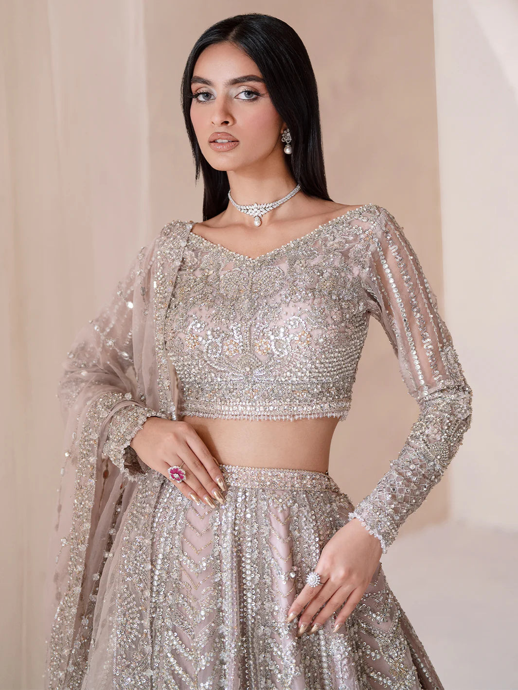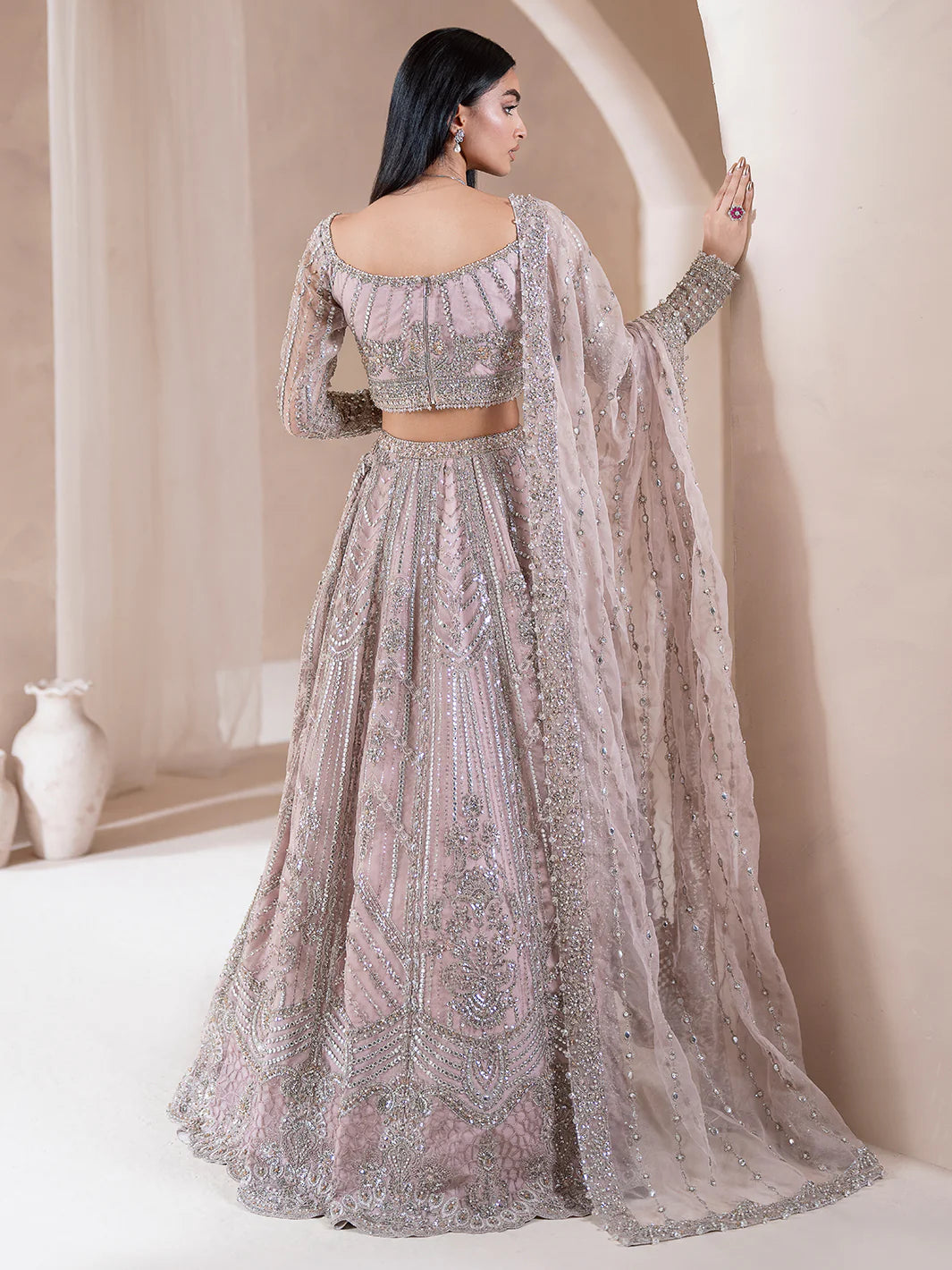 Coeur a dulcet symphony in muted pink, where romance meets refinement. This lehnga choli, paired with a four sided embroidered dupatta, evokes timeless allure. Embellished with thread work, tilla, cut dana, batki, pearls, crystals, and sequins, each motif breathes quiet opulence. A testament to delicate craftsmanship, Coeur shimmers with the poetry of love woven into every thread.
