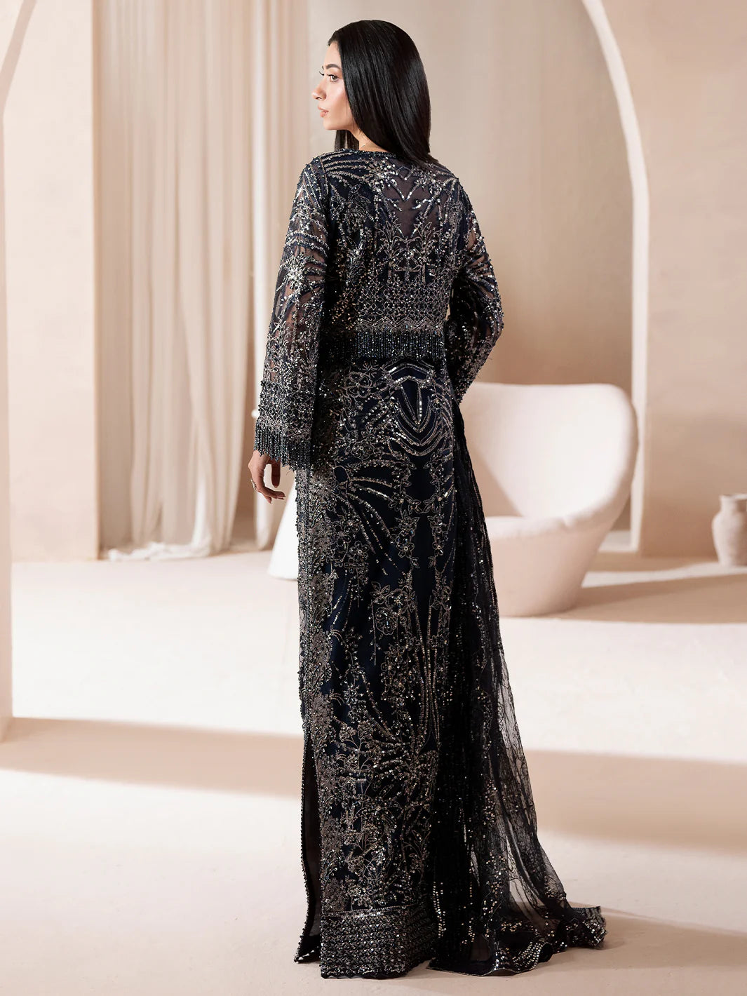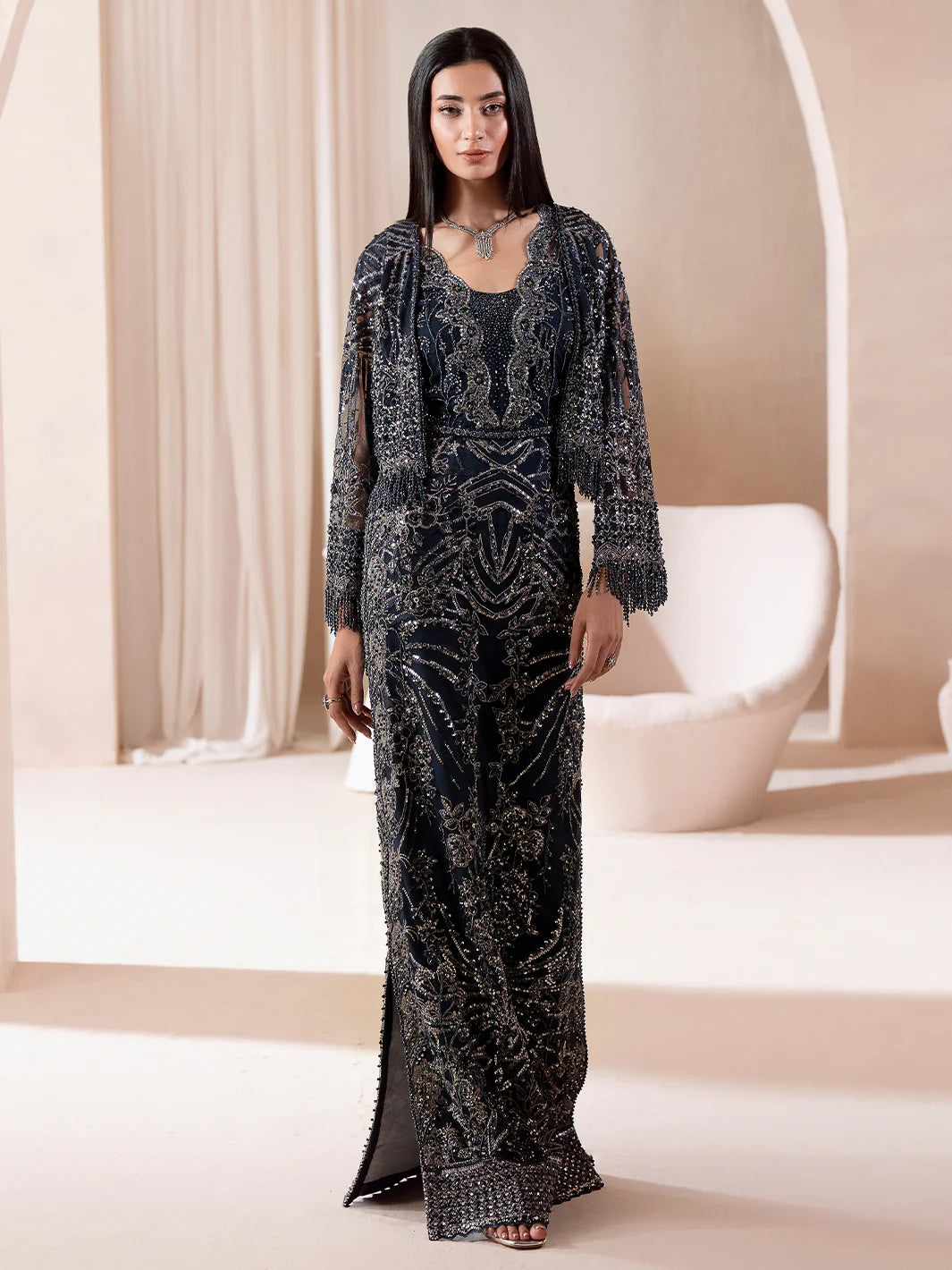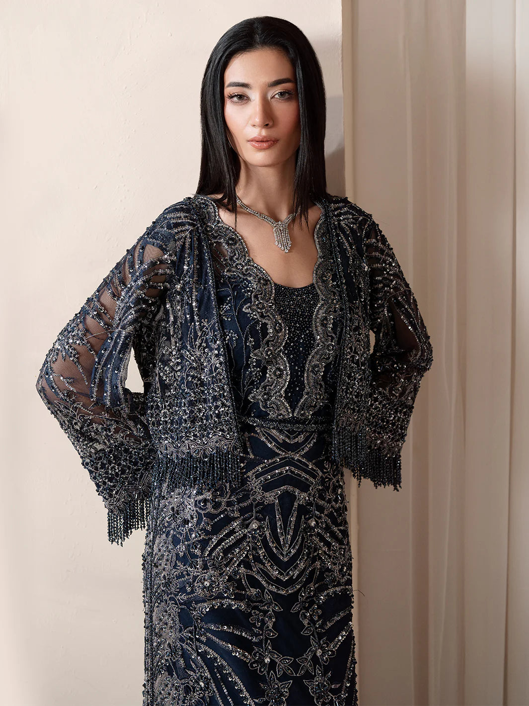 Feu a deep blue ensemble of sarong dress, jacket, and dupatta, Feu is a vault of artisanal splendor. Gilded Tilla work and cut dana shimmer under the glow of batki, pearls, and crystals. A constellation of sequins and stark white florals dances across the fabric, crafting a mesmerizing symphony of texture and light. This is wearable artistry a treasure of midnight allure, realized in the hush of moonlight.