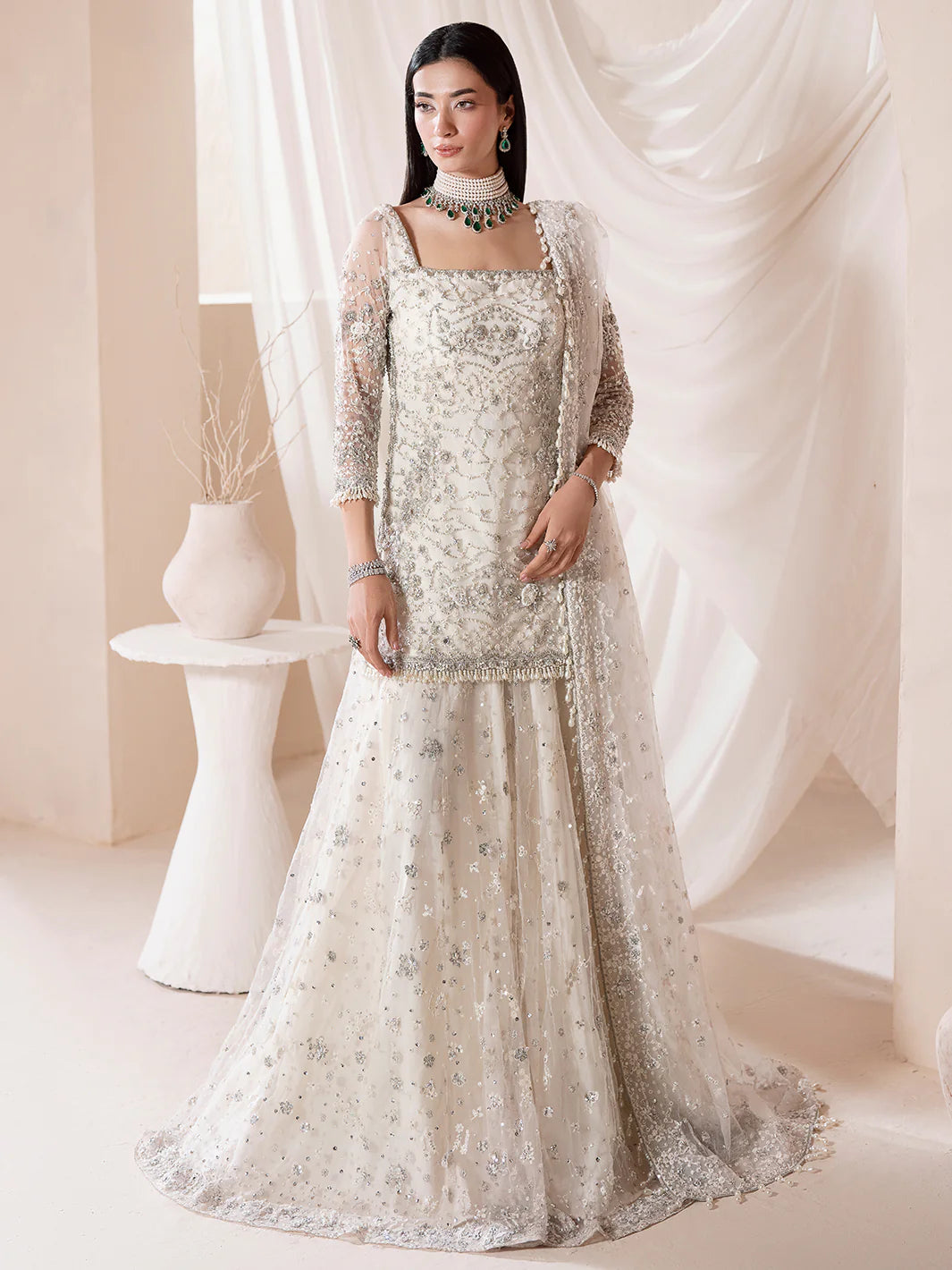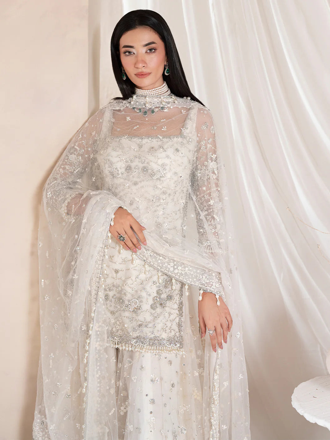 Noore is a vision in white, a short kurti exquisitely paired with a flowing sharara. It is a panaroma of artistry, where traditional Tilla embroidery and delicate cut dana are illuminated by the sparkle of pearls, crystals, and mukesh. Each detail, from the shimmering sequins and batki to the subtle glint of mirror work, has been thoughtfully placed. Blooming with intricate 3D flowers and finished with gotta work, this ensemble doesn't just capture light, it becomes it.