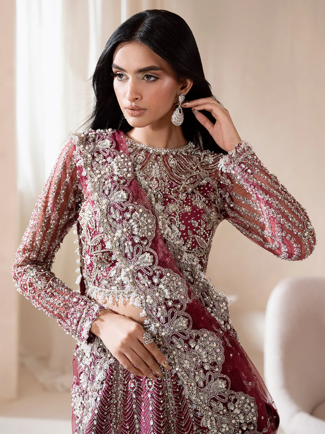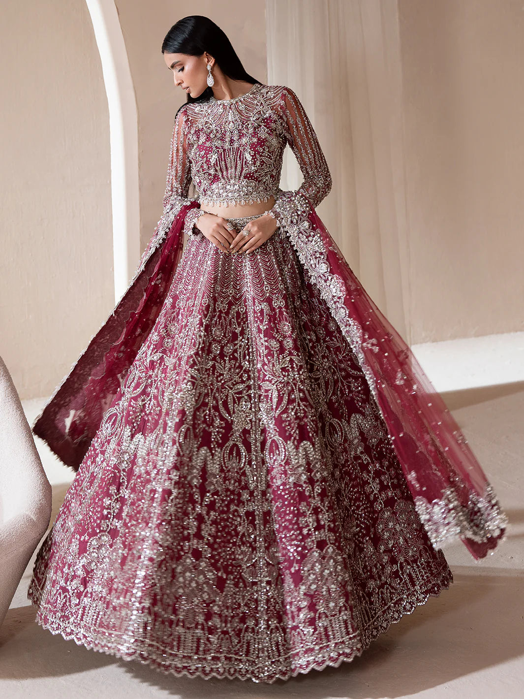 Reine Bathed in the richness of magenta, captures the essence of regal allure. Its lehnga choli and delicately draped dupatta unfold in layers of thread work, tilla, cut dana, batki, pearls, crystals, and sequins each stroke a whisper of opulence. The ensemble radiates a quiet power, where splendour meets subtlety. Reine a vision of sovereignty, crafted for the woman who embodies grace and command.