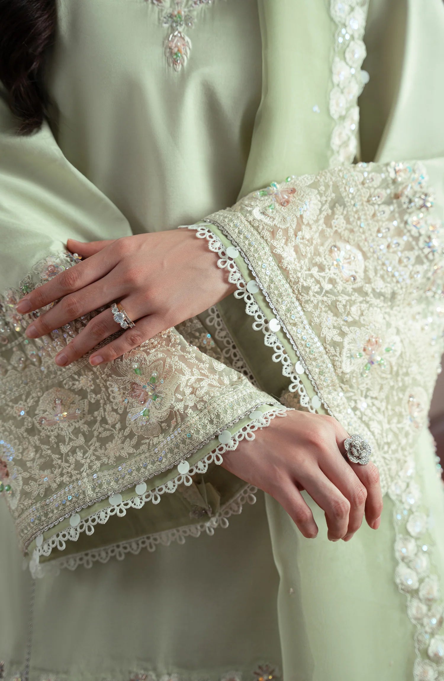 An ode to refined sophistication — this pistachio grip silk shirt radiates understated elegance with its smooth texture and graceful silhouette. Paired with a raw silk trouser that brings depth and richness, the ensemble is elevated by a sheer organza dupatta, adding a touch of ethereal finesse. A perfect pick for festive gatherings and elegant soirées, this look embodies timeless charm.