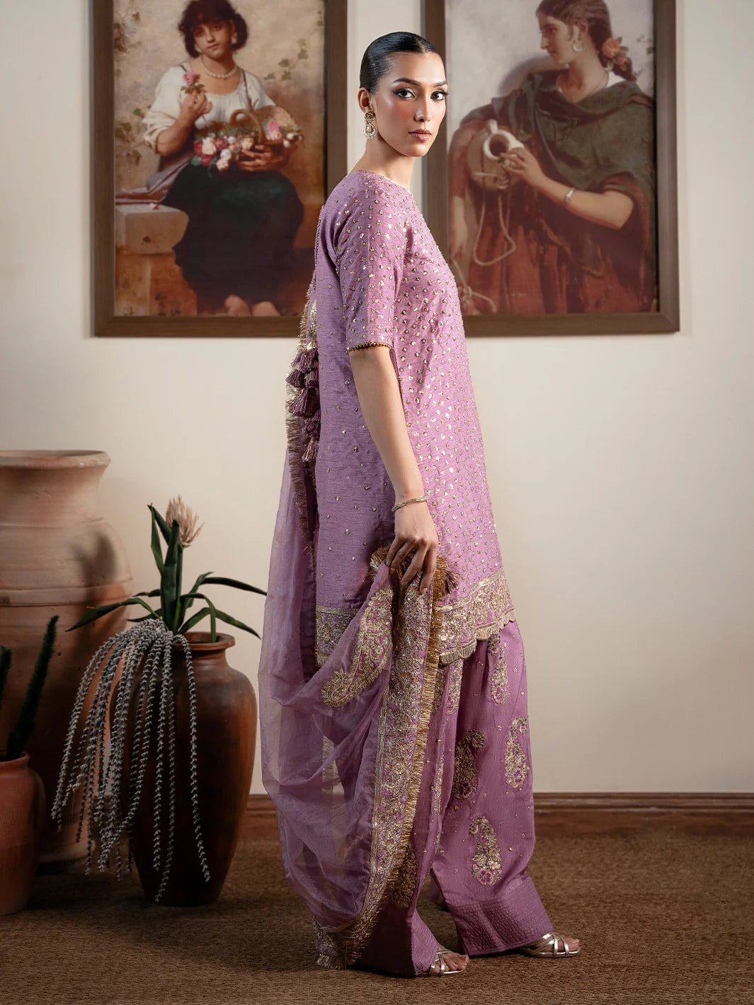 Purple silk shirt paired with a farshi shalwar both carrying subtle multicolored embroidery that adds vibrance to the look. The ensemble is completed with organza dupatta finished with paisleys and embroidered border.