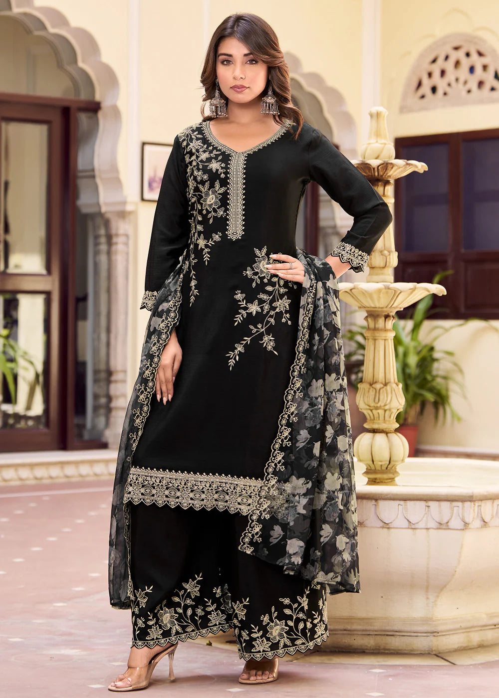 Floral Printed and Embroidered Palazzo Suit