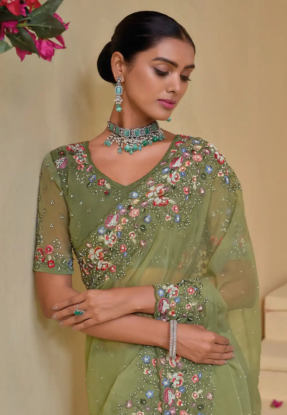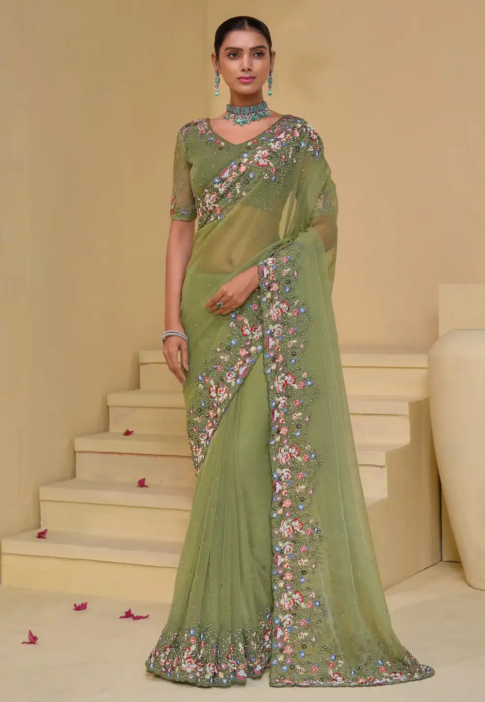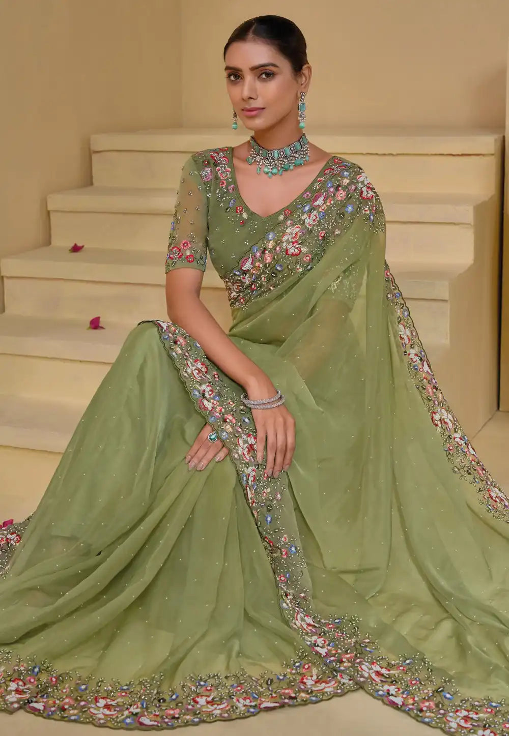 This Green Embroidered Banarasi Saree showcases a pure banarasi tuscany fabric embedded with intricate embroidery. Accompanied by a matching tuscany fabric blouse for a complete ensemble.