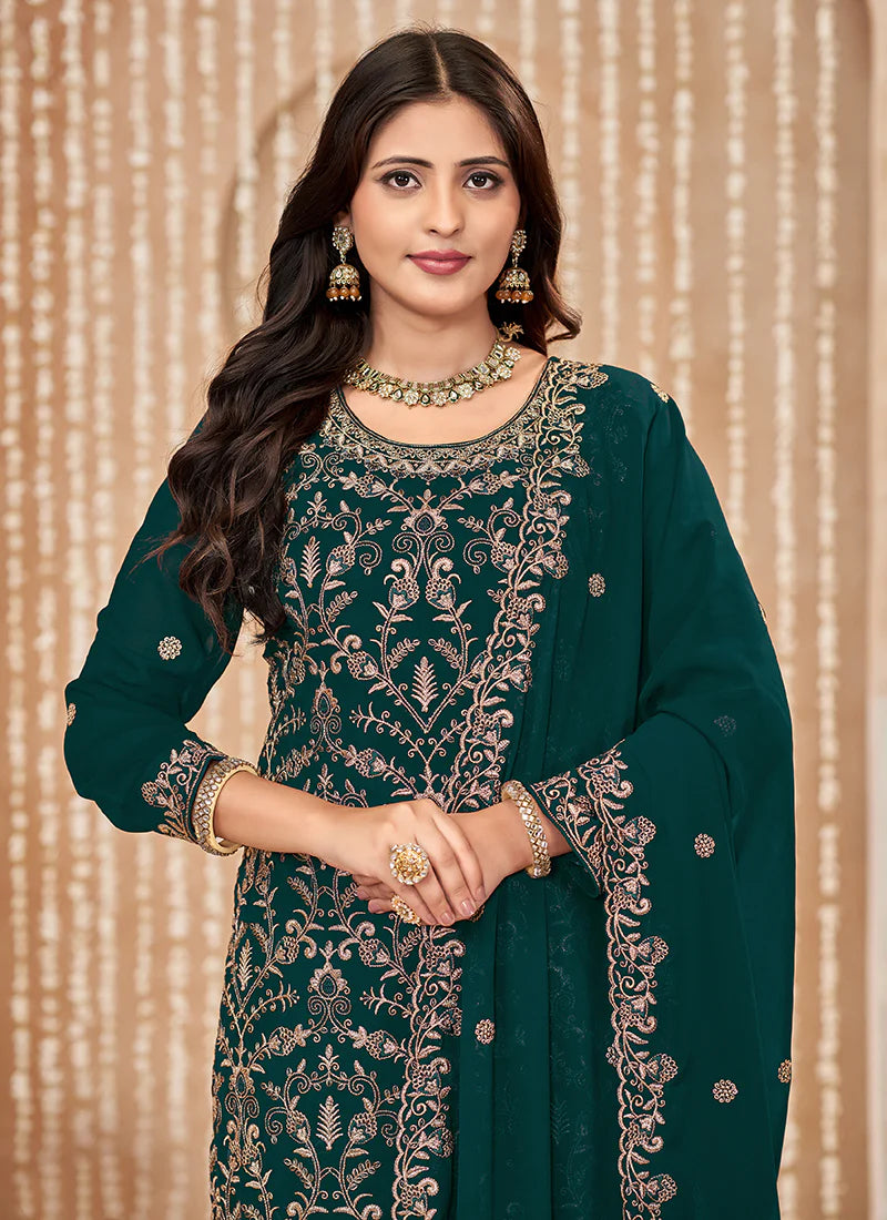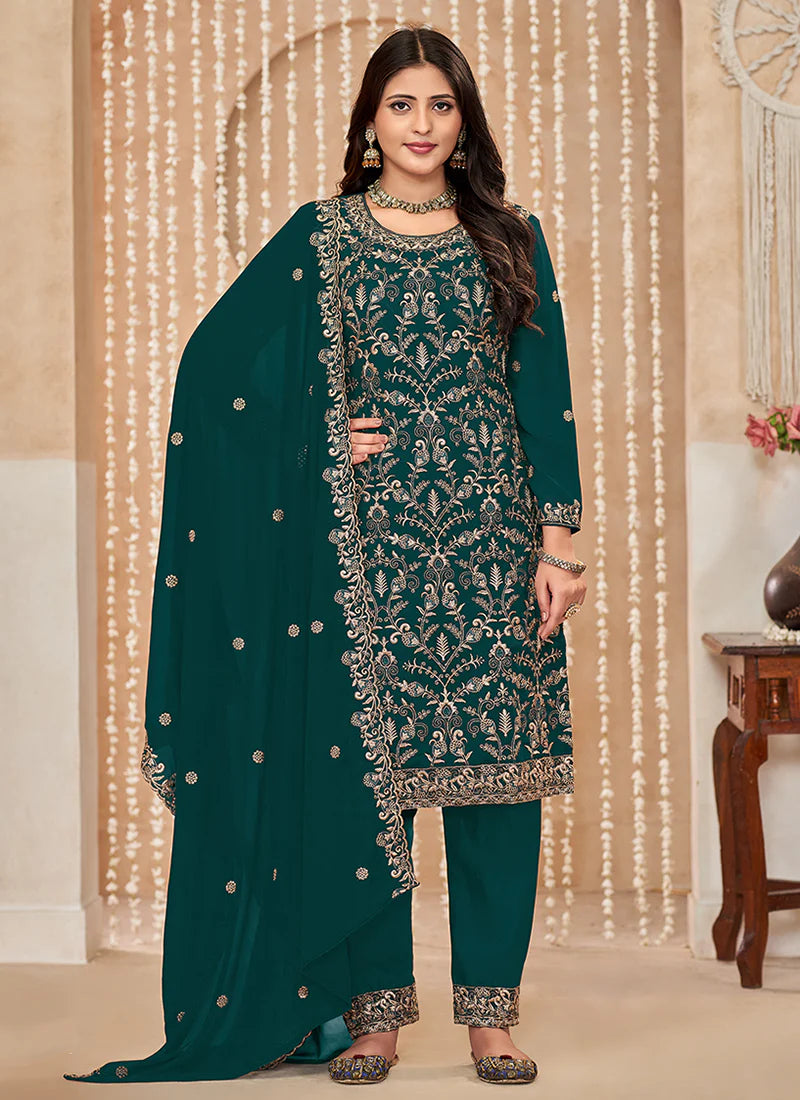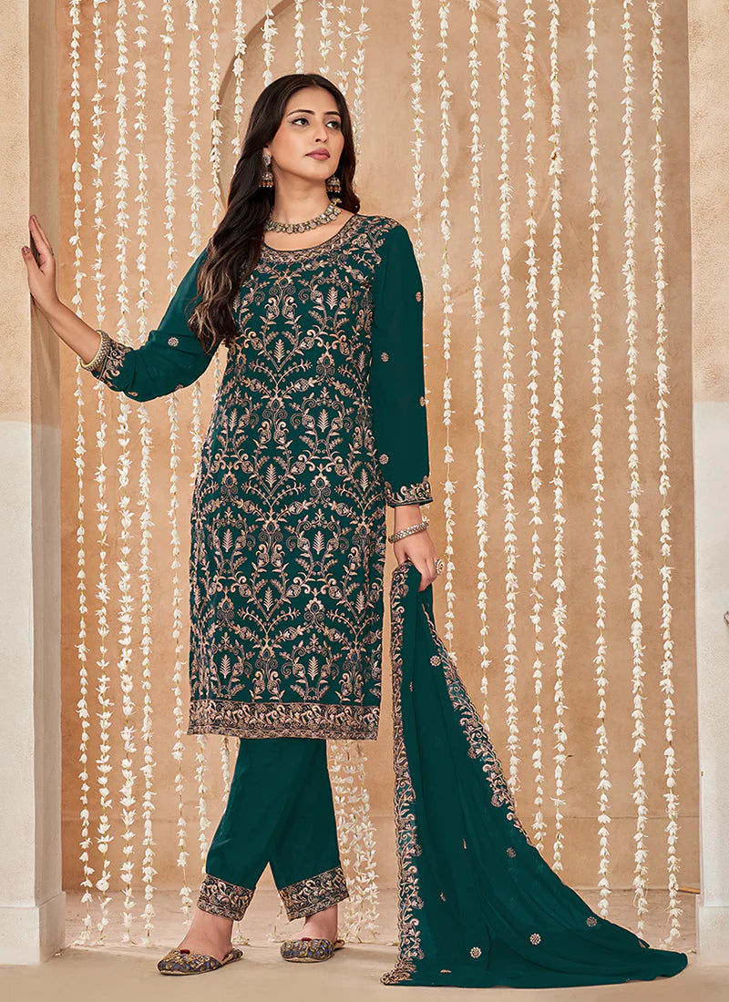 Green Embroidered Pant Style Suit features a georgette kameez with embroidery work. Comes with santool inner and bottom alongwith georgette embroidered dupatta.