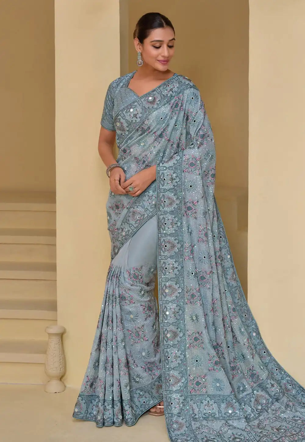 This Blue Embroidered Banarasi Saree showcases a pure banarasi tuscany fabric embedded with intricate embroidery. Accompanied by a matching silk fabric blouse for a complete ensemble.