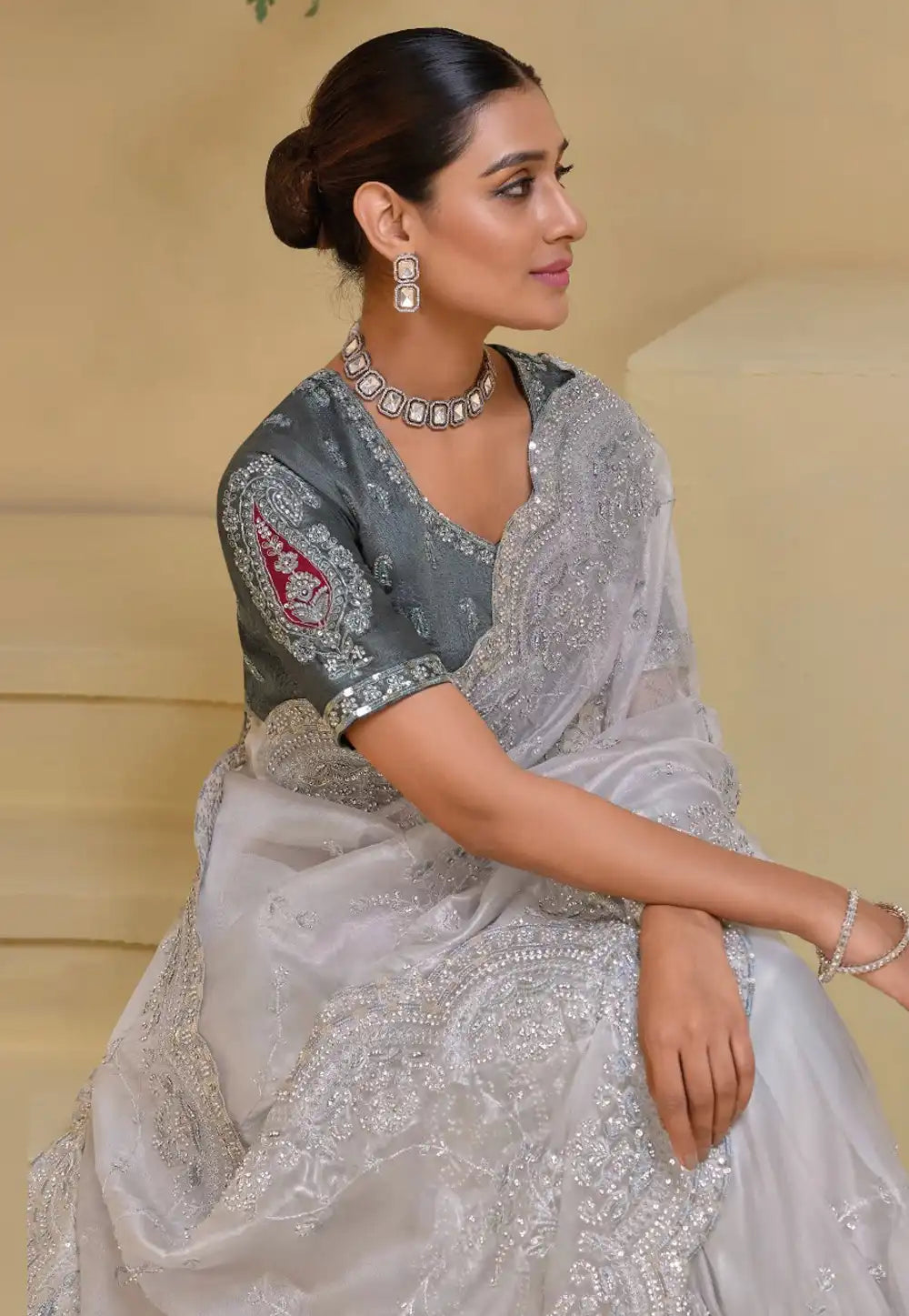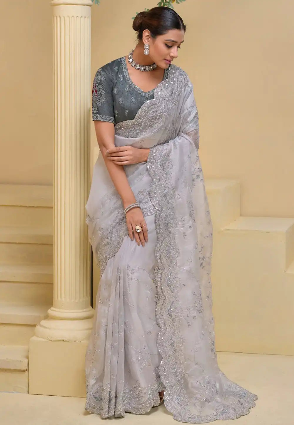 Grey Embroidered Banarasi Saree