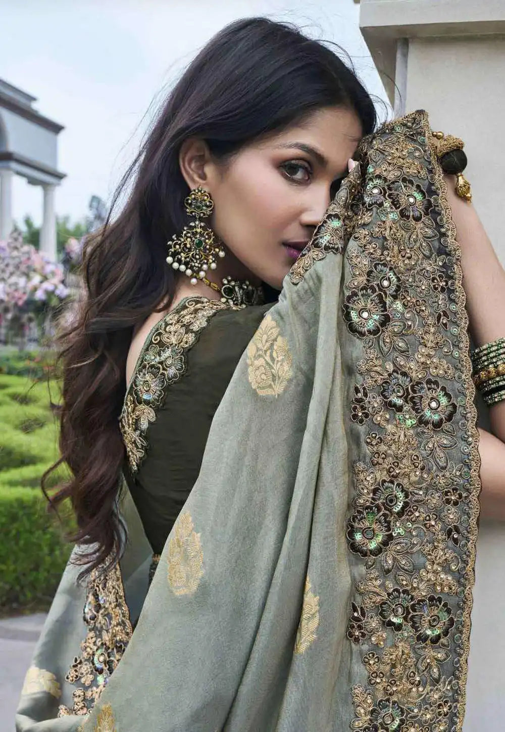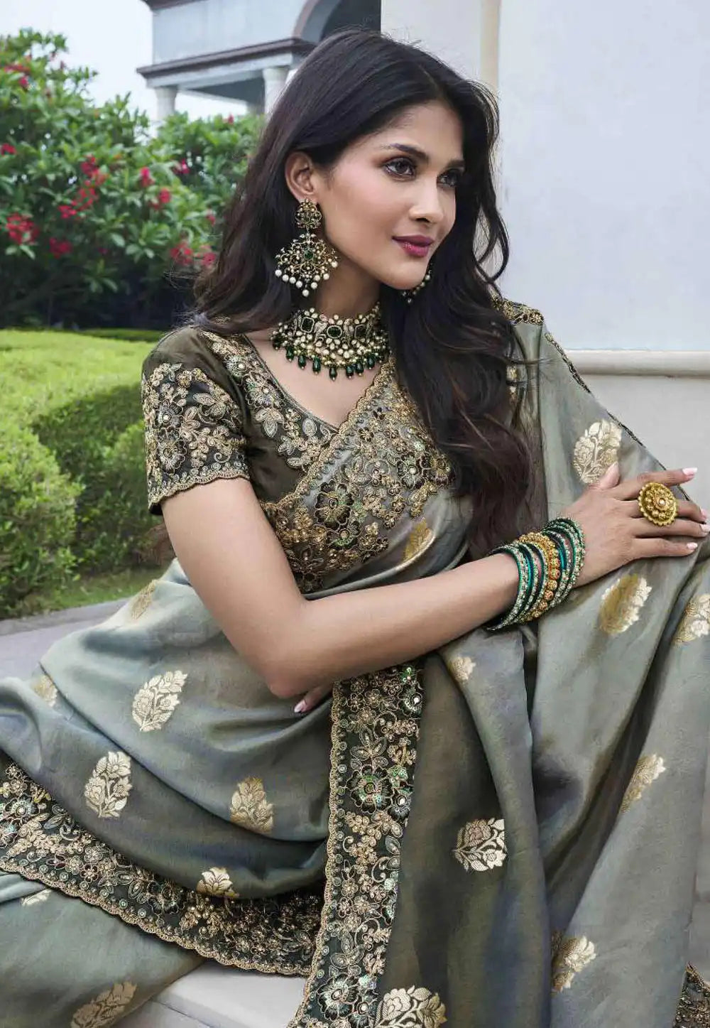 Grey Embroidered Wedding Saree features a silk scalloped saree in enhanced with dangles, zari woven in floral motifs and resham, zari, sequins border work. Comes with silk embroidered blouse.