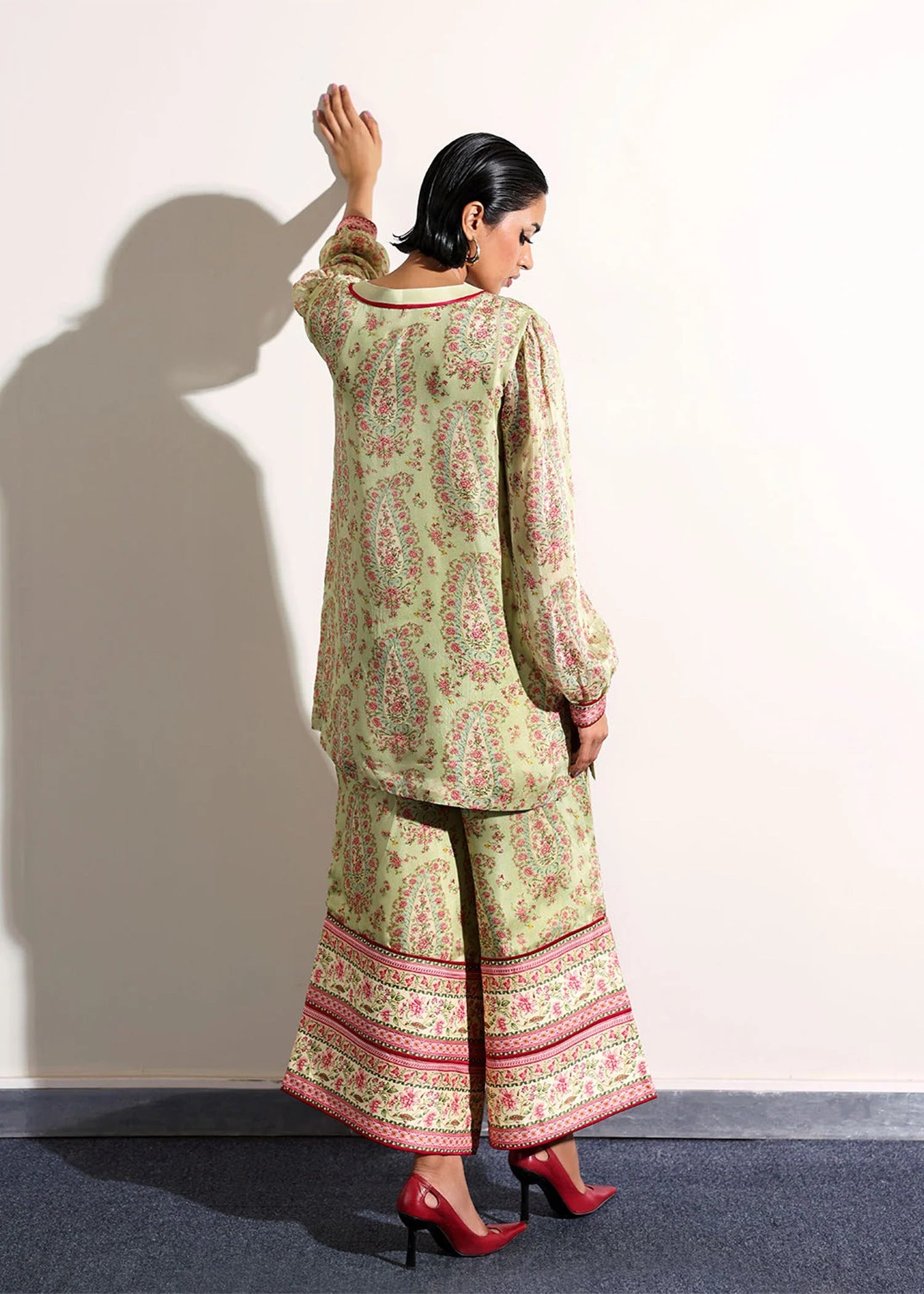 A light parrot green silk coord set featuring an all-over paisley print, complemented by a parrot green silk collar band and delicate pink satin silk tassels and trims. The balloon sleeves are finished with floral print cuffs and subtle pink satin piping for added texture. Paired with matching printed culottes featuring a bold double border — a playful yet polished silhouette rooted in soft contrasts and thoughtful detailing.