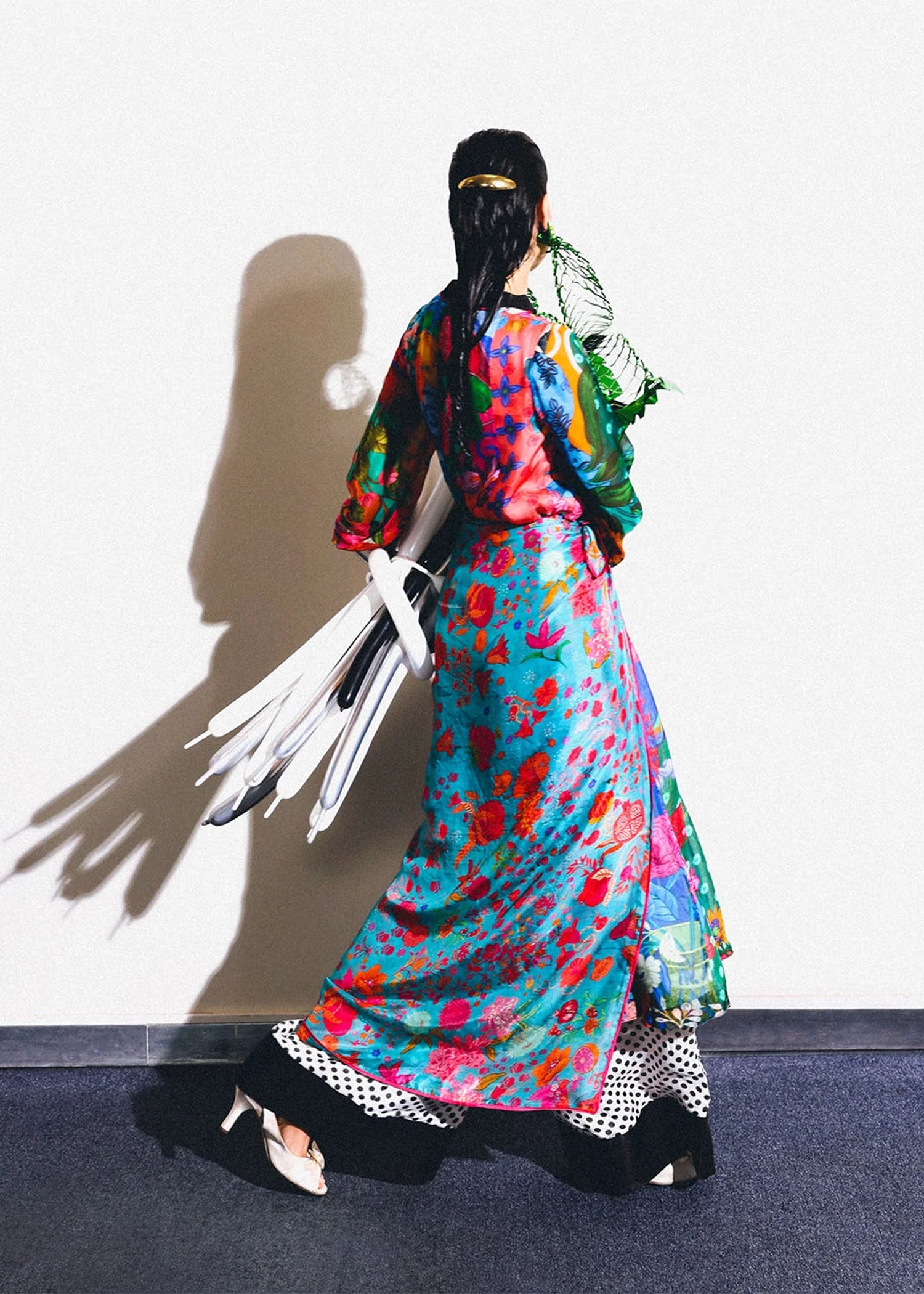 A mid-calf, A-line silhouette brought to life with vibrant multicolored printed silk panels. Accented with black satin silk trims along the neckline, sleeve cuffs, and trouser hem, and finished with soft pink satin piping for a subtle contrast. Paired with black and white polka dot trousers for a playful yet refined finish.