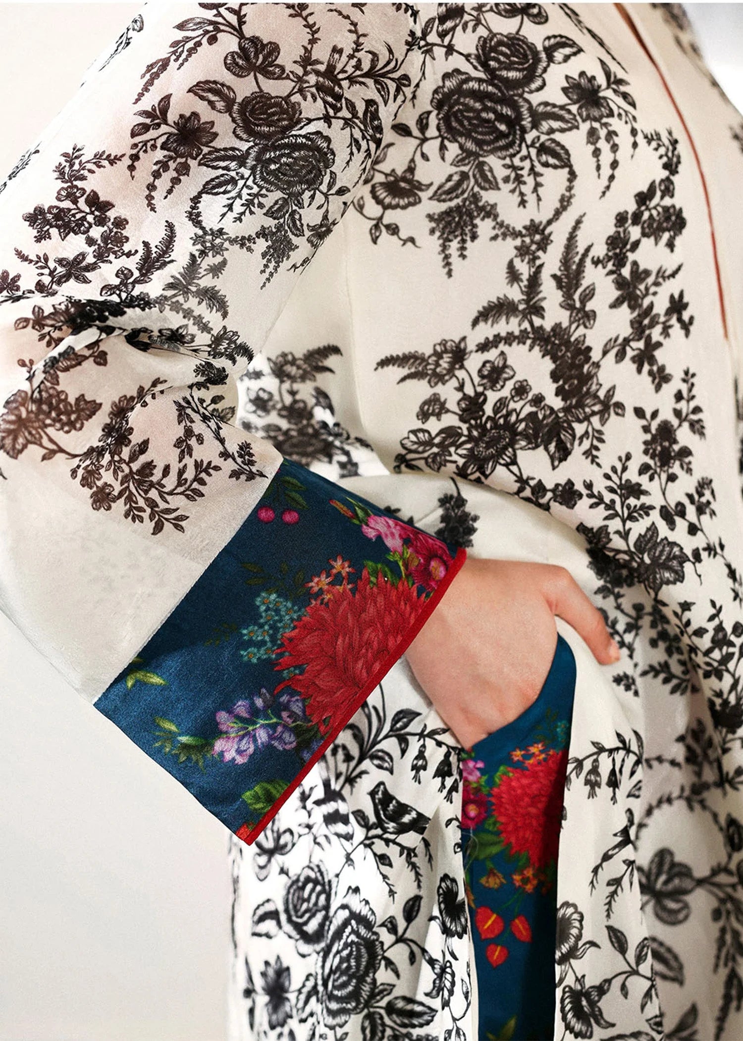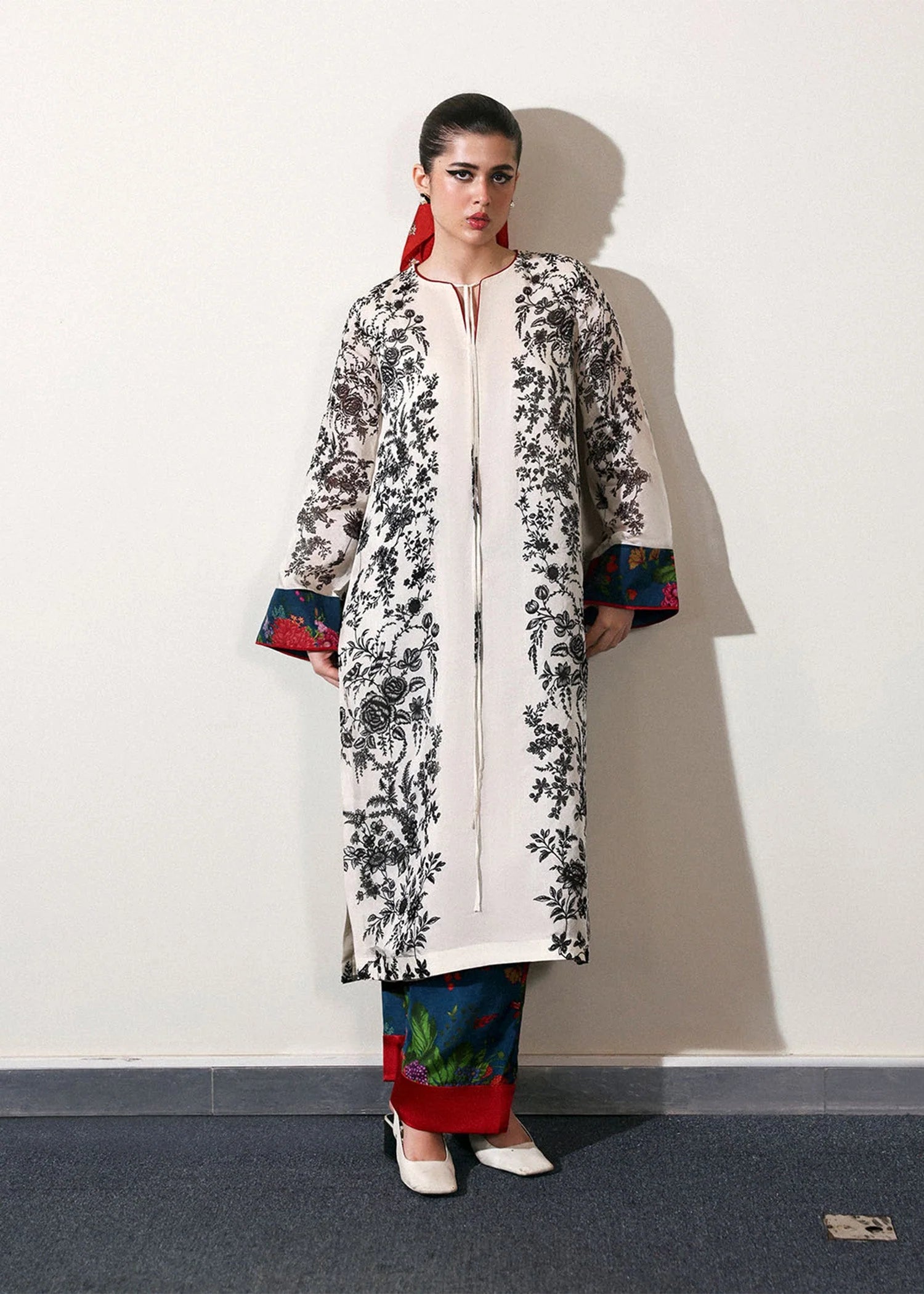 An ivory long shirt with sketchy black floral print, accented with red satin silk trims, printed tassel on the neckline and contrasting blue and red floral printed cuffs on the sleeves. Paired with matching blue and red floral printed pants, finished with a wide red satin silk border at the hem.