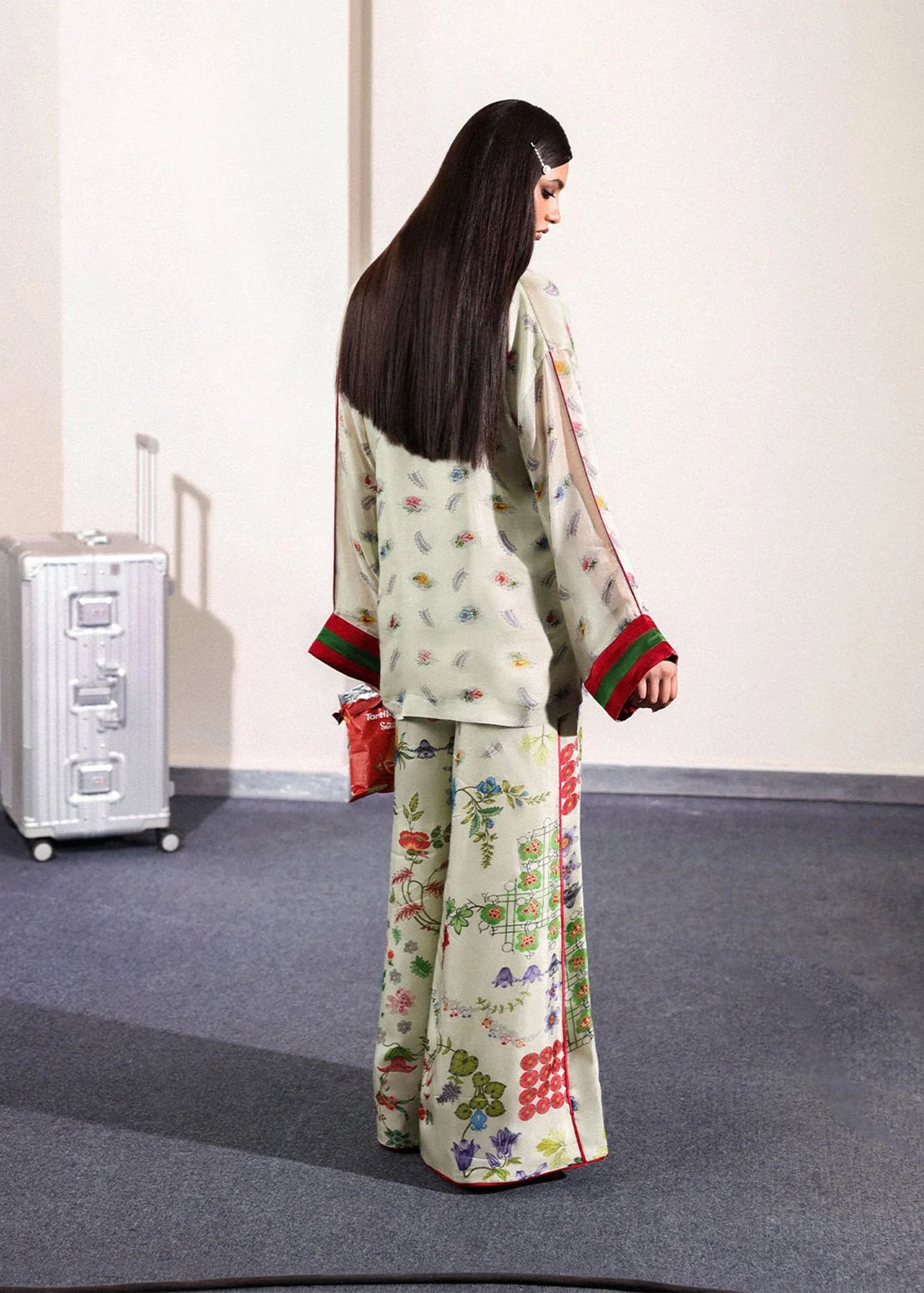 A light pistachio green silk coord set featuring a delicate floral repeat on the shirt, contrasted by a bolder floral print on the flared pants. Designed with green and red satin silk accents along the sleeve hems, neckline, and flared pants’ side seams and hem for a striking finish. A printed collar and red satin tassel detail add dimension and charm — blending softness with vivid color play.