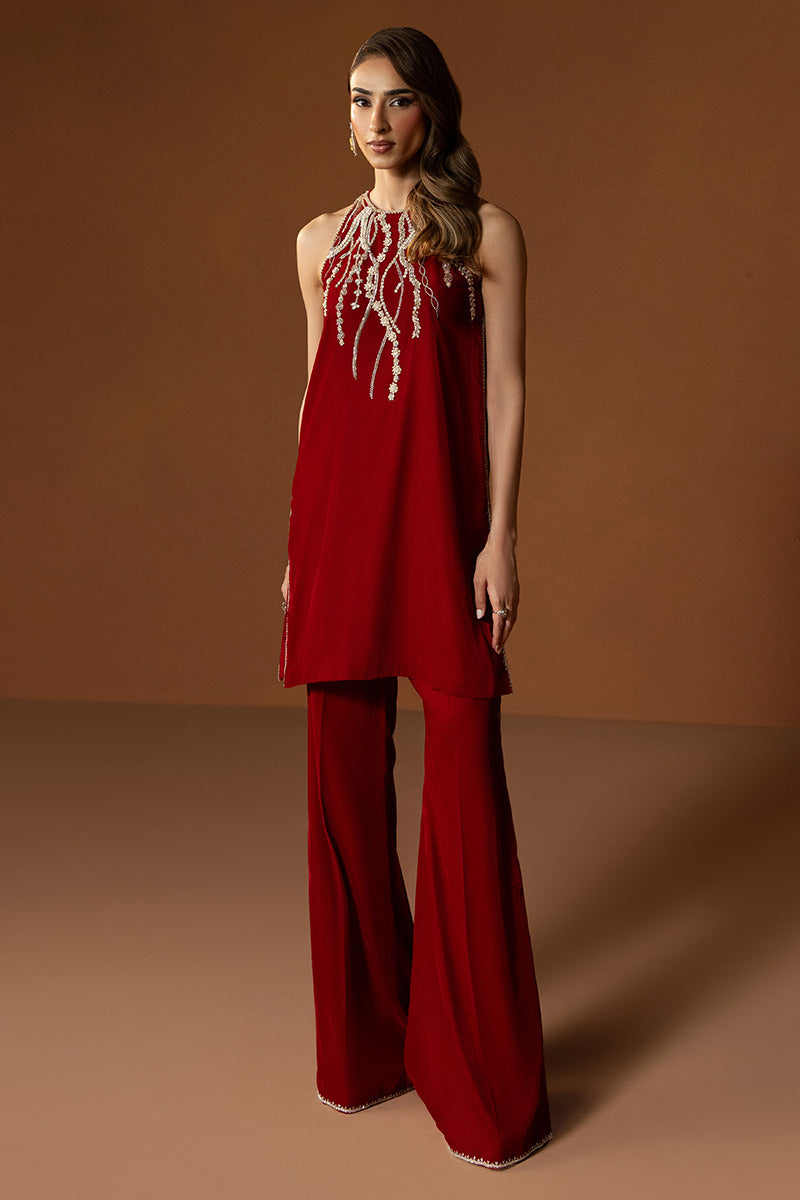 Achieve an ethereal charm in this deep red velvet outfit. The short shirt is beautifully detailed with intricate embellishments around the neckline, showcasing refined at its finest. Paired with elegantly tailored boot-cut pants and a fluid medium silk dupatta detailed along the borders, Allure is a true reflection of modern grace.
